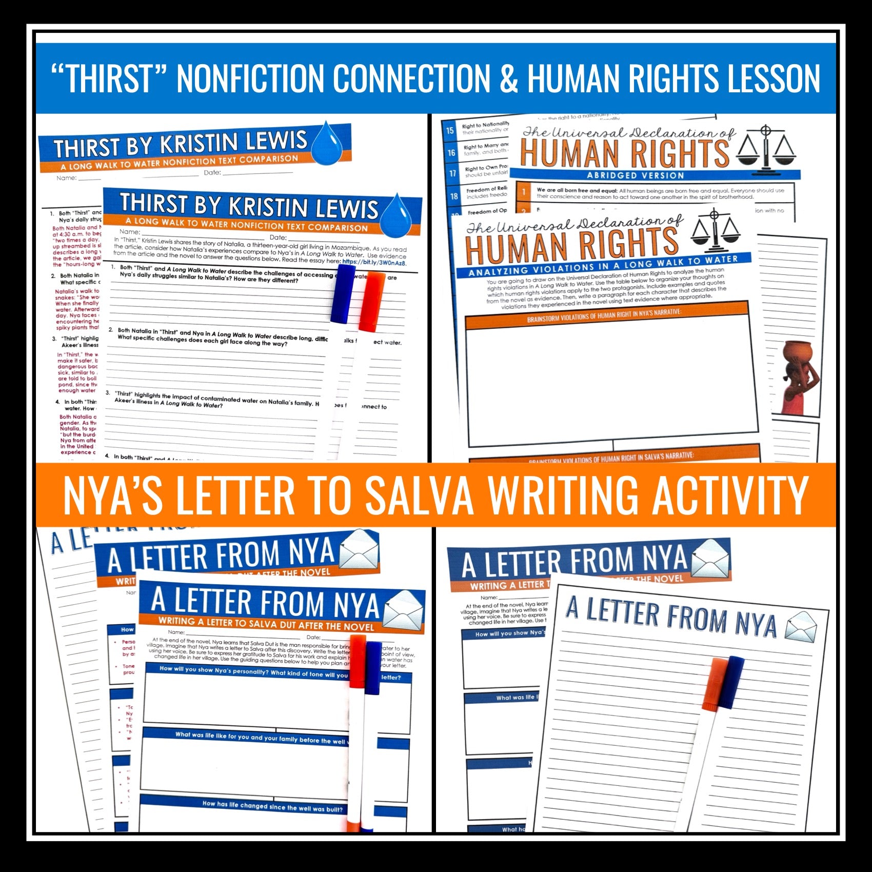➡️ Human Rights Lesson & Analysis: This lesson challenges students to think critically about human rights and how they’re denied in times of war, poverty, and crisis. After studying the Universal Declaration of Human Rights, students connect its core principles to A Long Walk to Water, analyzing how Salva’s and Nya’s stories reveal violations of rights to safety, education, equality, and access to clean water.