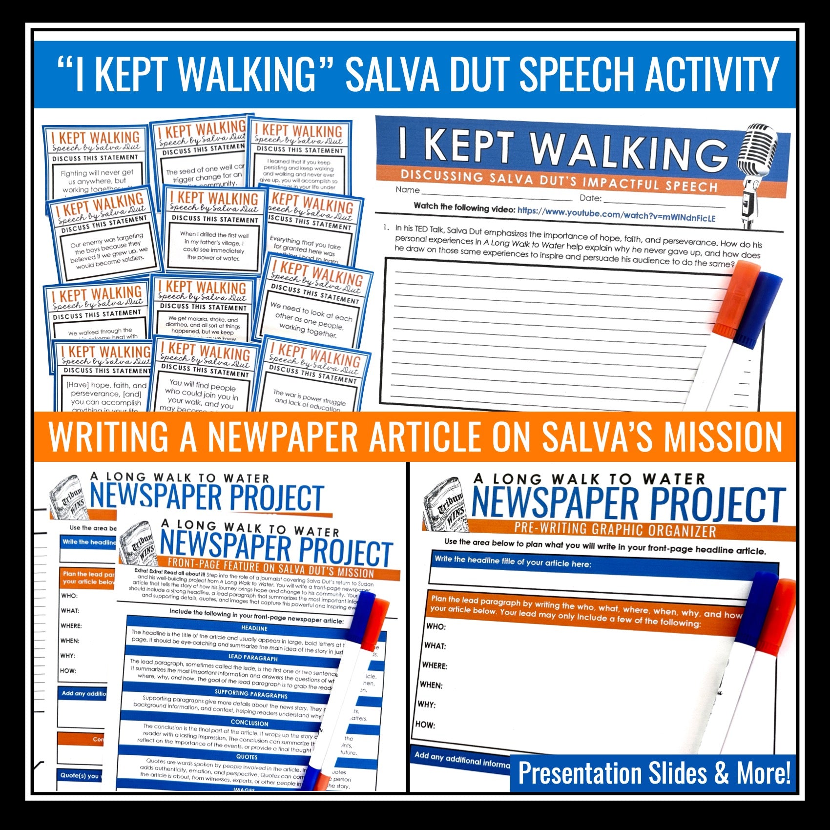 ➡️ “I Kept Walking” – Salva Dut Speech Activity: After watching Salva Dut’s inspiring TED Talk, students reflect on the power of perseverance, hope, and leadership. Using discussion task cards, they analyze key quotes from his speech, connect his words to events in A Long Walk to Water, and respond to one prompt in depth, exploring how Salva’s message of “keeping walking” continues to impact lives today.
