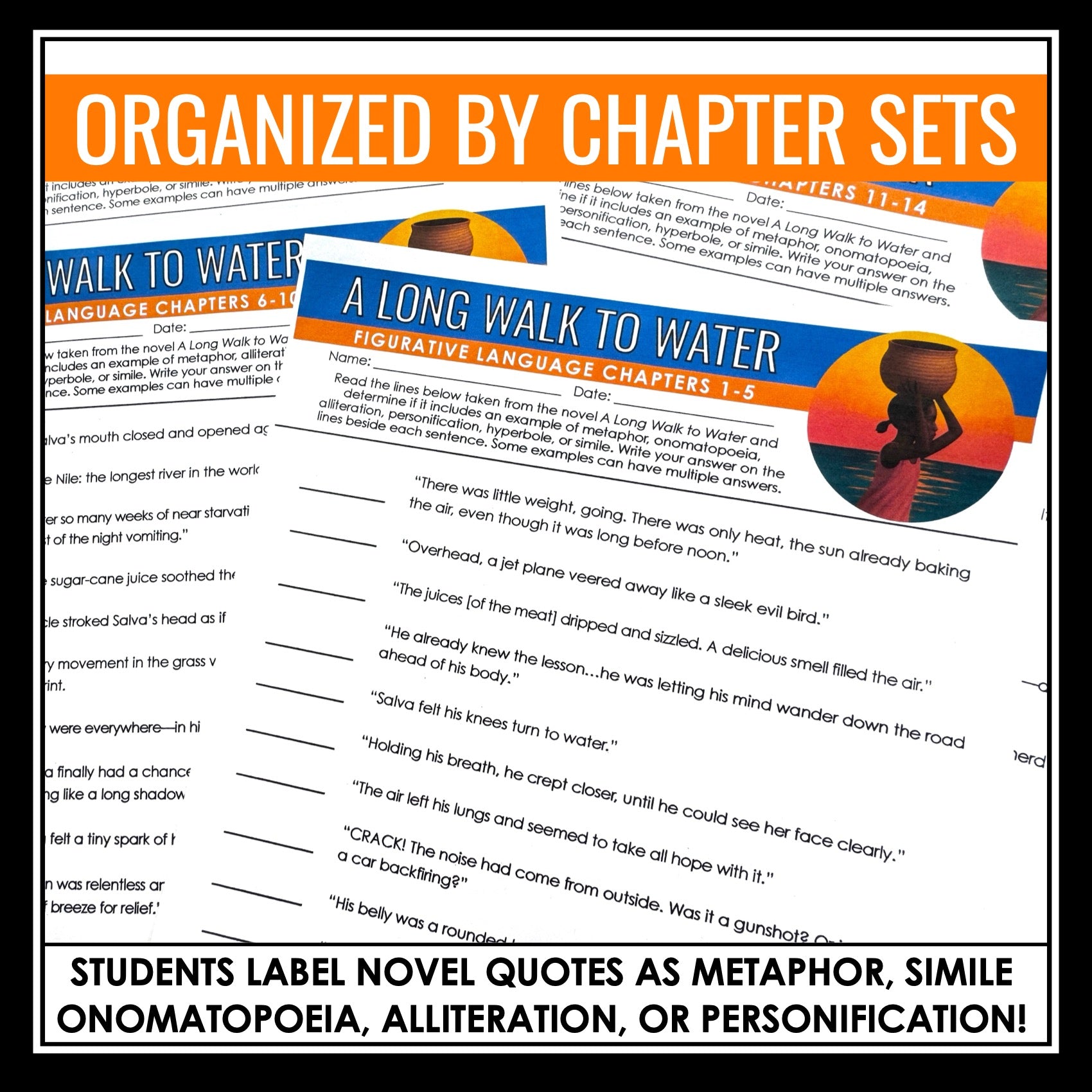 ➡️ 4 A Long Walk to Water Figurative Language Assignments: Each print-ready worksheet includes carefully selected quotes from the novel. Students identify and label the type of figurative language used in each example (metaphor, simile, personification, alliteration, hyperbole, and onomatopoeia). Each worksheet corresponds to a specific chapter set: