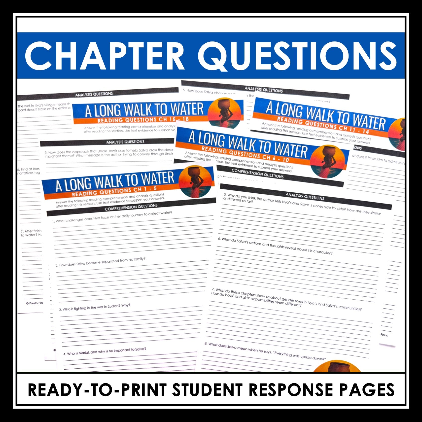 ➡️ A Long Walk to Water Questions Student Response Pages: These printable response sheets follow the sections outlined in the student handout, with space provided for student responses. Perfect for in-class assignments, homework, or independent reading support.