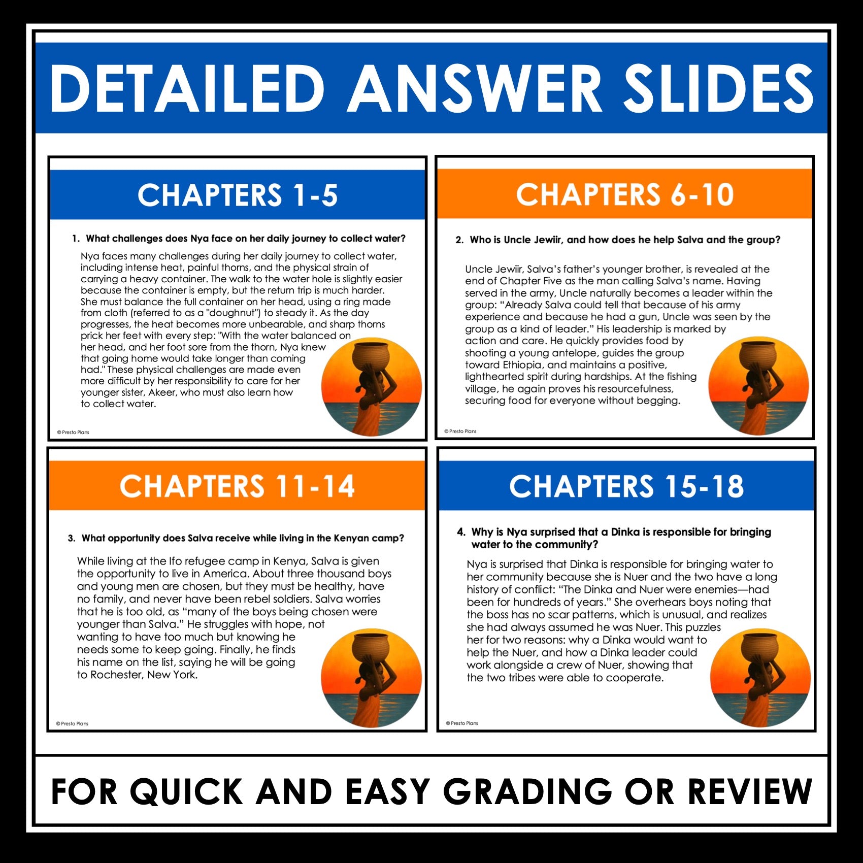 ➡️ A Long Walk to Water Questions Presentation Slides: A presentation displaying each question alongside an evidence-based answer drawn directly from the text is also included. Use it for whole-class review, discussion, or small-group reteaching sessions to reinforce key concepts and support text-based responses.