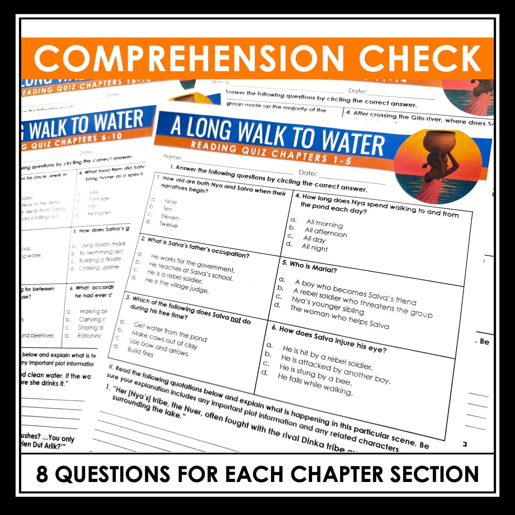 ➡️ A Long Walk to Water Quizzes: This resource contains four quizzes that assess comprehension across the full novel. Each quiz includes: