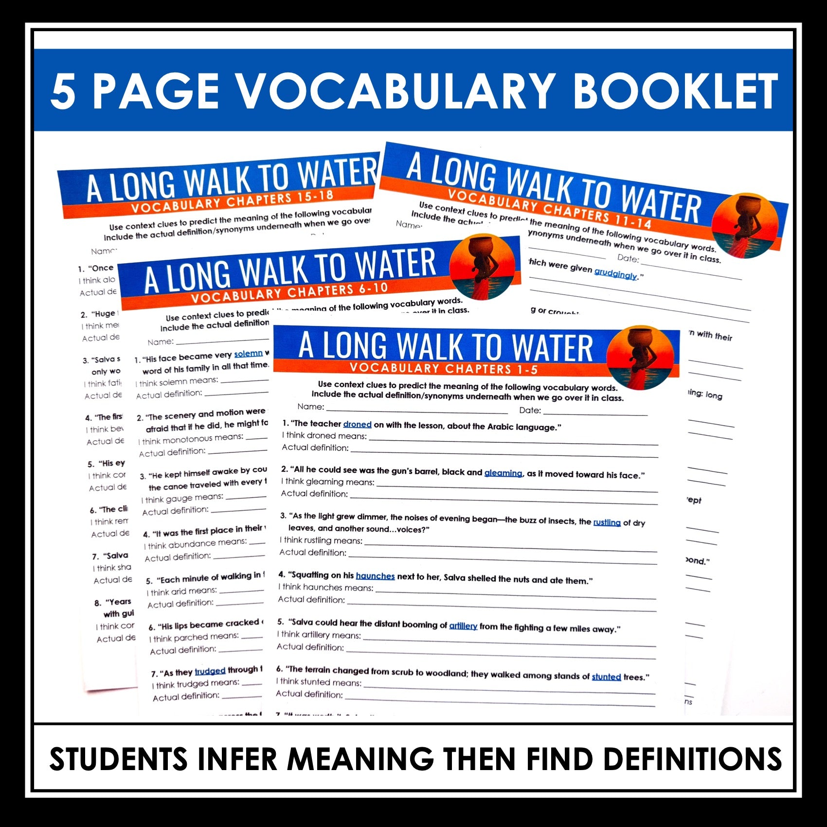 ➡️ A Long Walk to Water Vocabulary Booklet: Each of the four booklet pages includes carefully selected quotes from the novel with bolded vocabulary terms. Students use context clues to predict the meaning of each word, then record or revise their definitions after reviewing them.