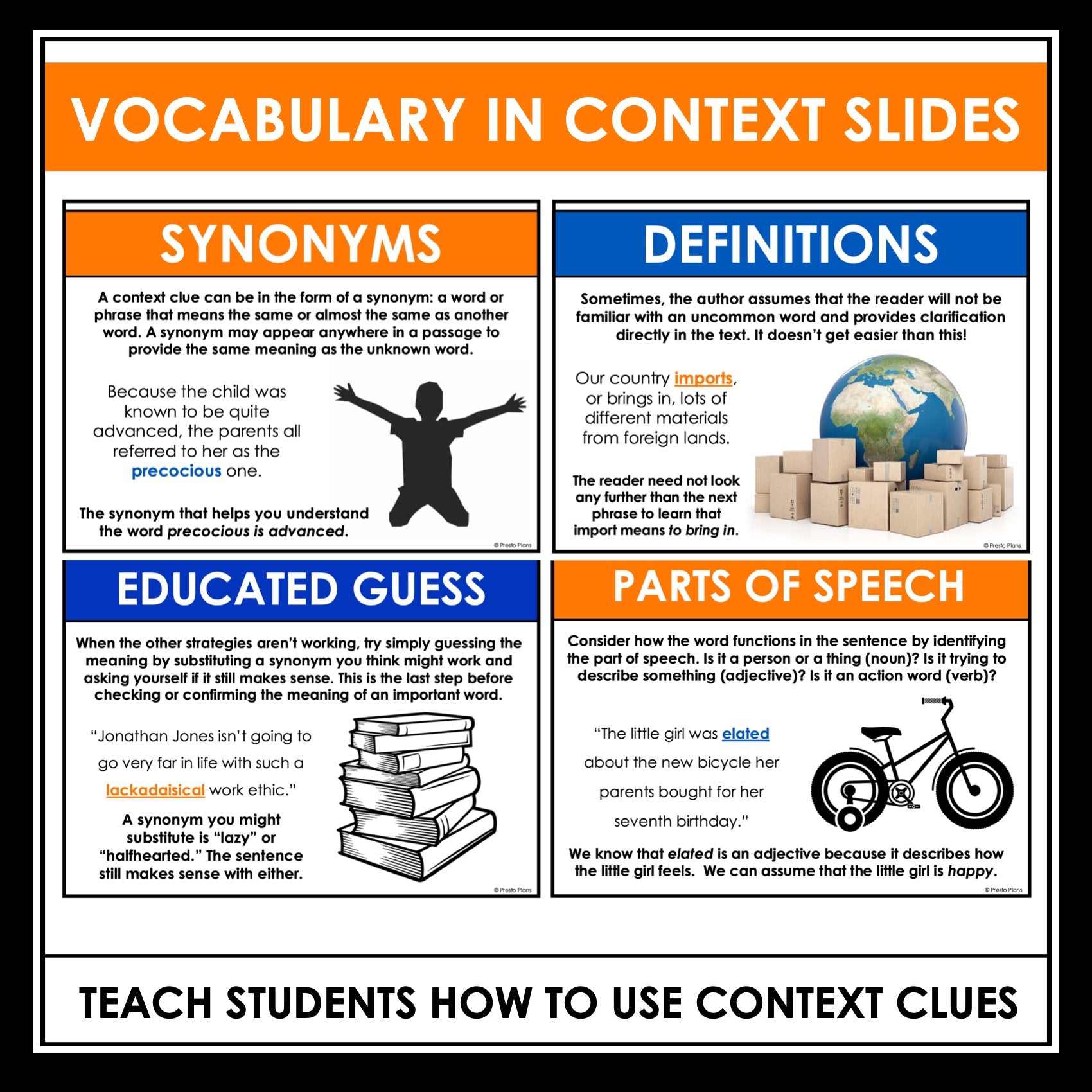 Begin by teaching students how to use context clues to figure out unknown vocabulary. Vocabulary activities are organized by the following chapter sections:
