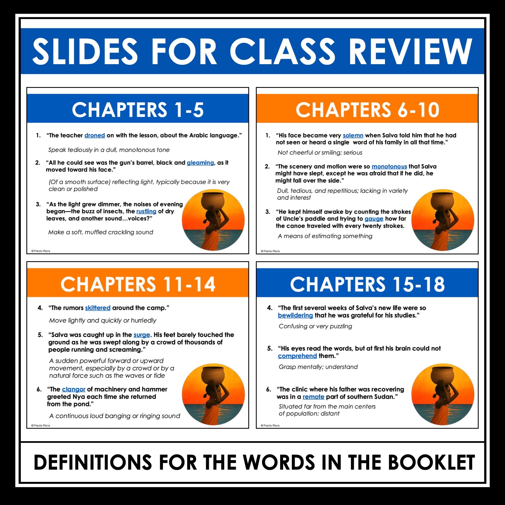 ➡️ A Long Walk to Water Vocabulary Definitions Presentation: After students complete their booklet activities, use this presentation to review and discuss the correct definitions. Each slide reinforces understanding by pairing the original quote with a student-friendly definition.