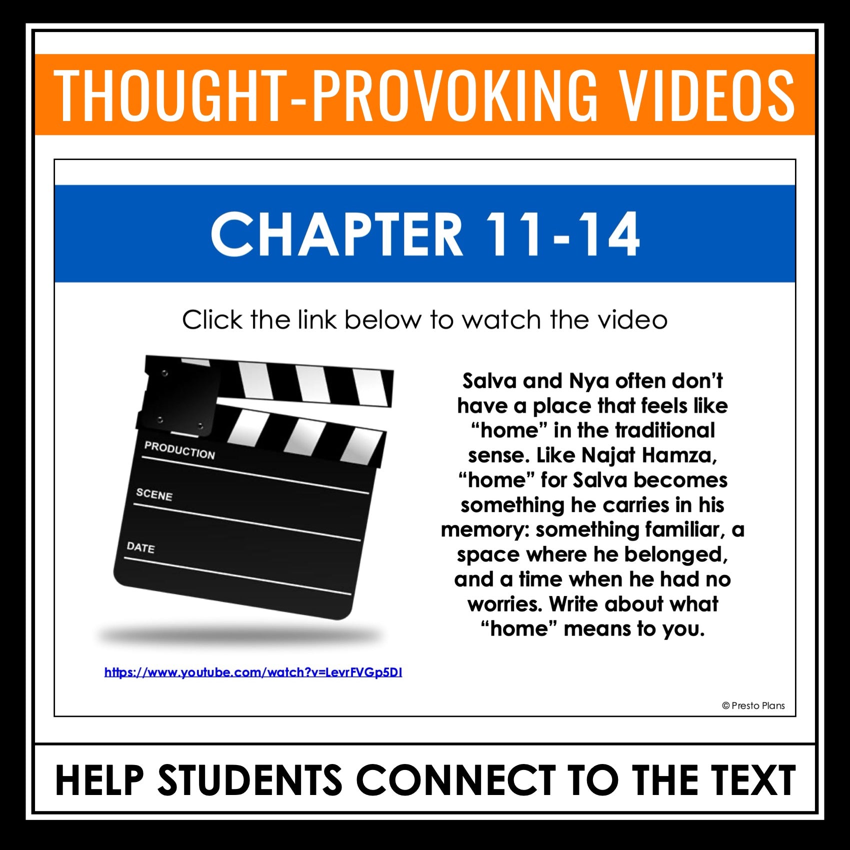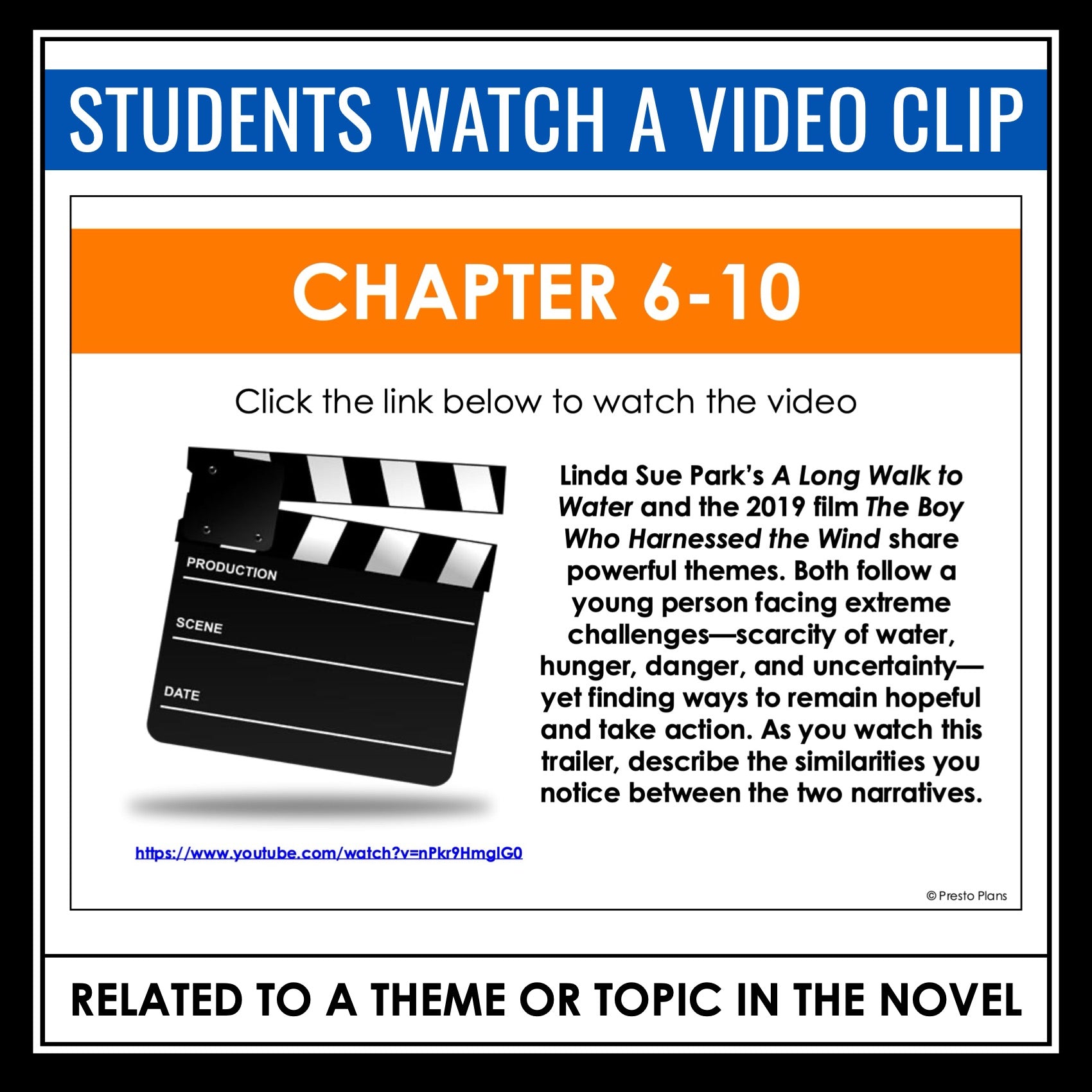➡️ A Long Walk to Water Video Journals Presentation Slides: A PowerPoint presentation featuring links to eight curated video clips, each paired with a reflective writing prompt connected to the novel’s central themes. The clips are organized by chapter sections, with two prompts per section: