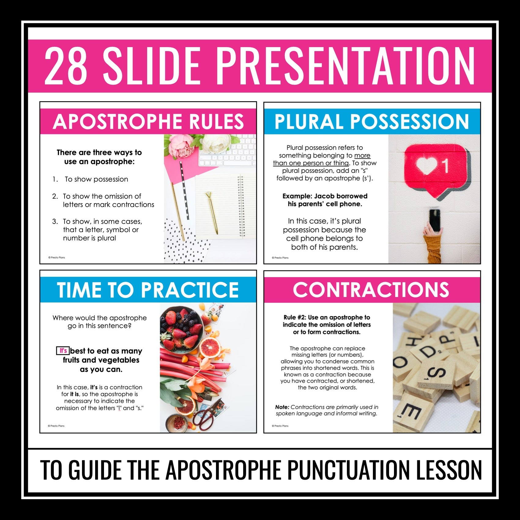 Empower your students to master apostrophe rules with this comprehensive digital grammar resource. The Google Slides presentation and activities are designed to cover three essential apostrophe rules: indicating possession, marking contractions and the omission of letters, and denoting plural forms of letters, symbols, or numbers in certain cases. The presentation offers clear explanations and examples to illustrate each rule, while the informational slides provide students with a handy reference guide for reinforcement. Additionally, the digital task cards activities provide interactive practice opportunities to solidify understanding and application of apostrophe usage.