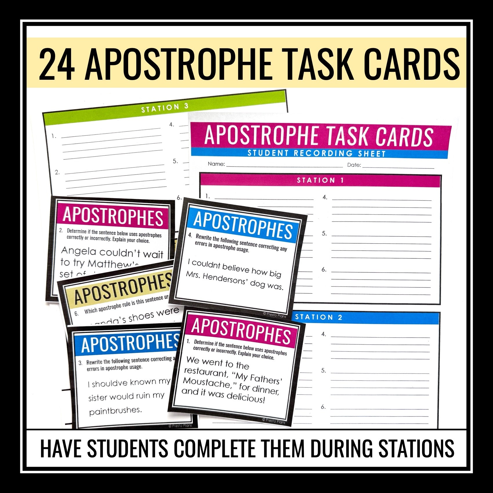 ➡️ Apostrophes Digital Task Cards Activities: Engage students with a dynamic digital task card activity that encourages active learning and application of apostrophe rules. With 24 digital task cards included, students can rotate around the room, completing exercises that reinforce their understanding of apostrophes. A student response slide and teacher answer keys are provided. The digital cards have different tasks: