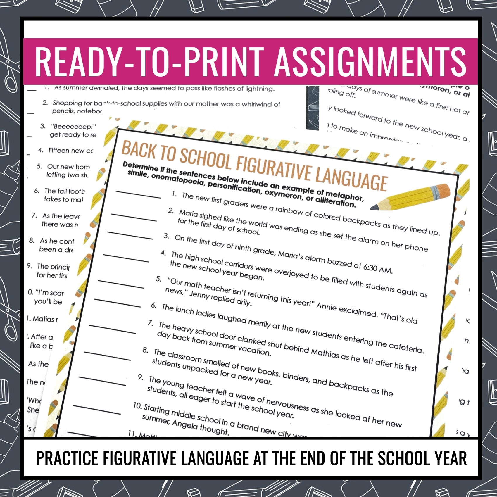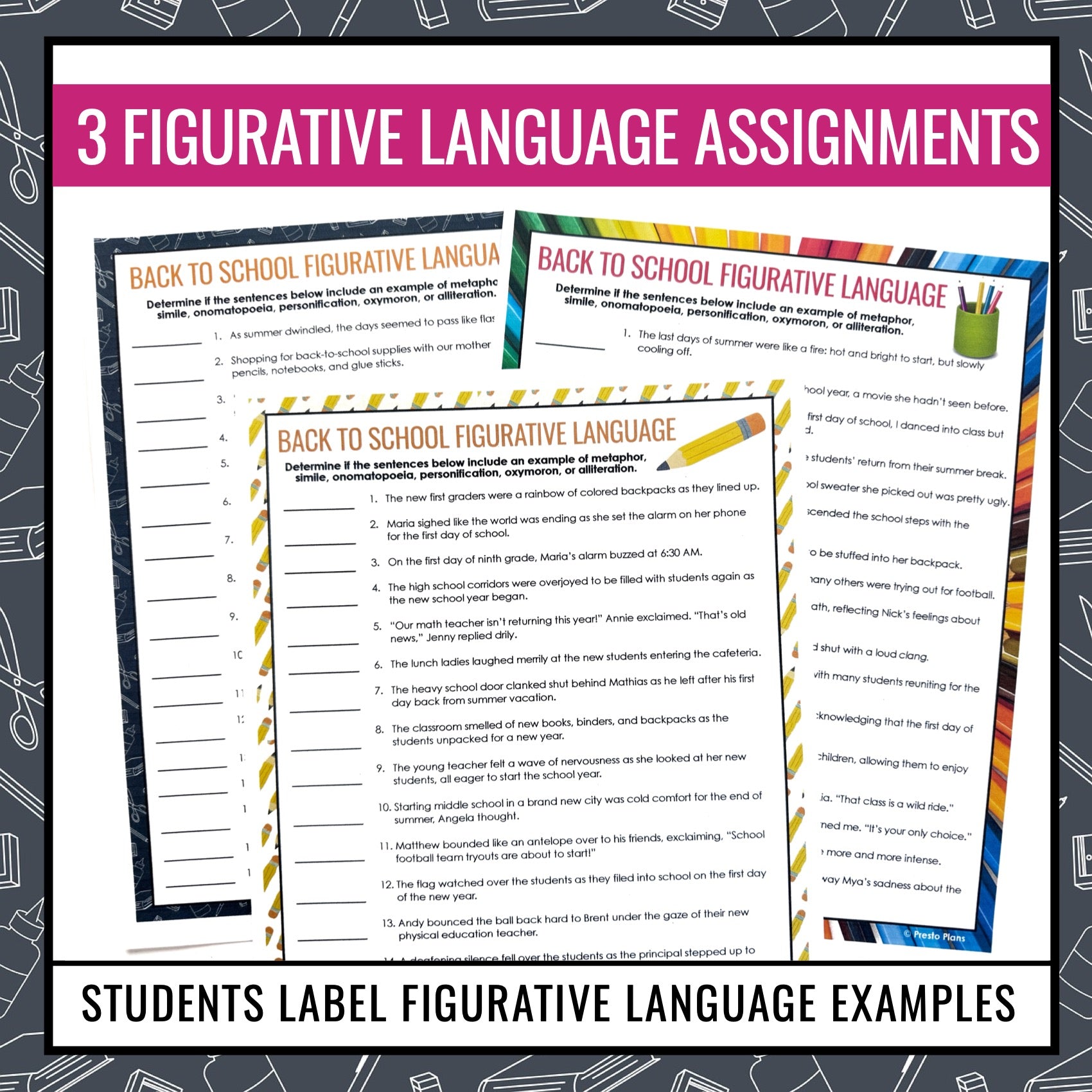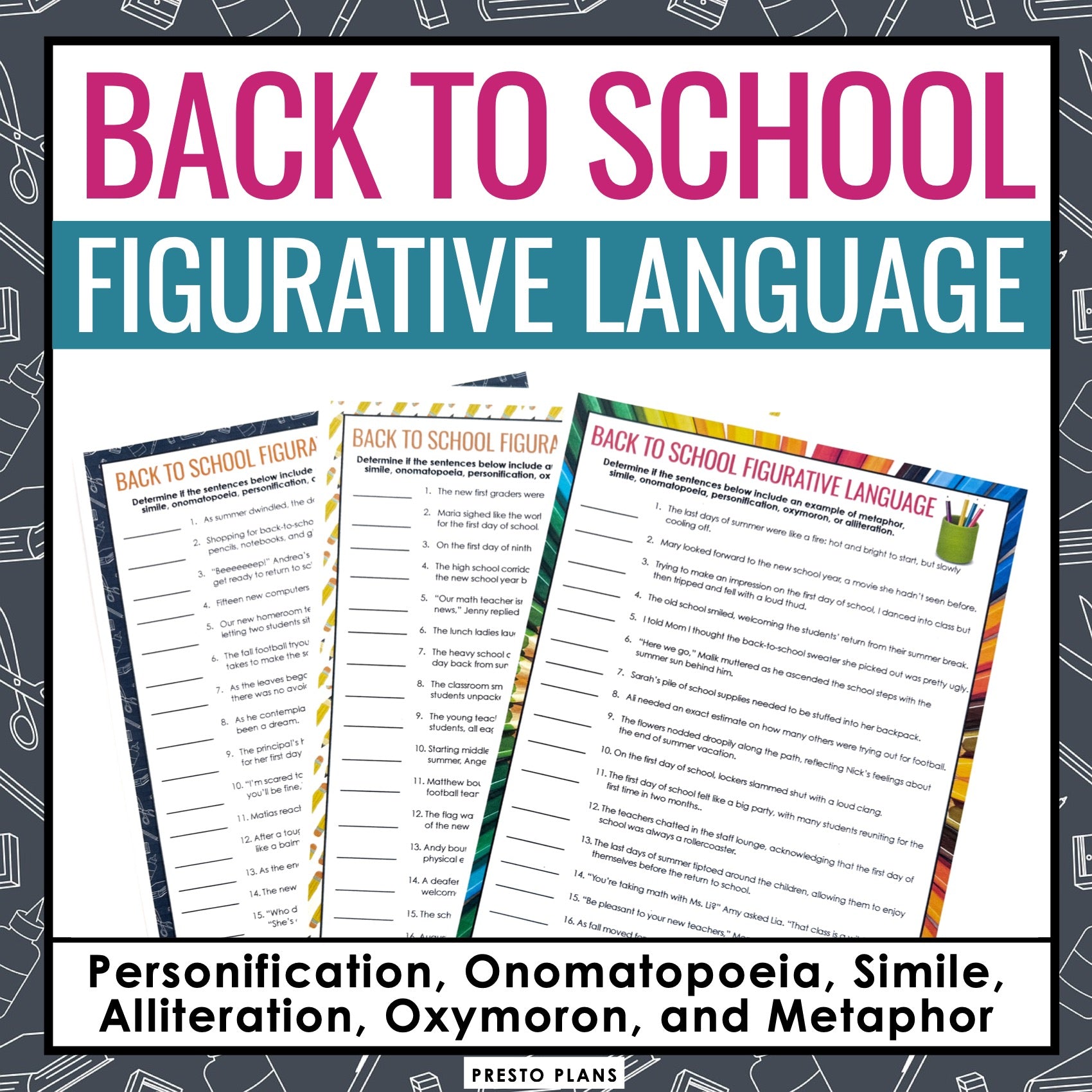 ➡️ 3 Back to School Figurative Language Assignment: Use these ready-to-print assignments that each include back to school themed sentences that incorporate an example of metaphor, simile, personification, alliteration, oxymoron, or onomatopoeia. Students will label the sentences with the proper figurative language!
