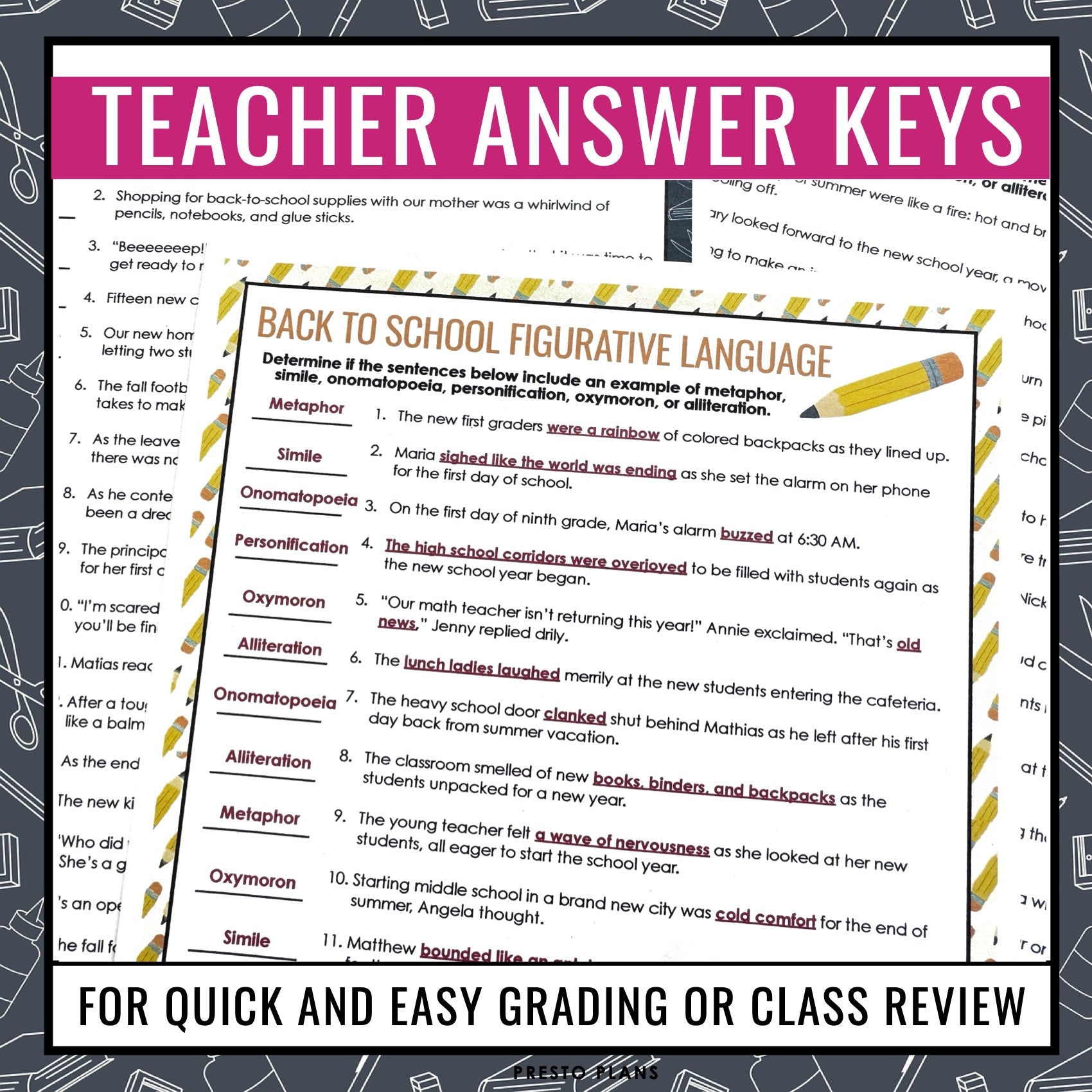 ➡️ Back to School Figurative Language Assignment Answer Keys: After students have completed the assignments, use the included answer keys to grade or review the answers with the students.