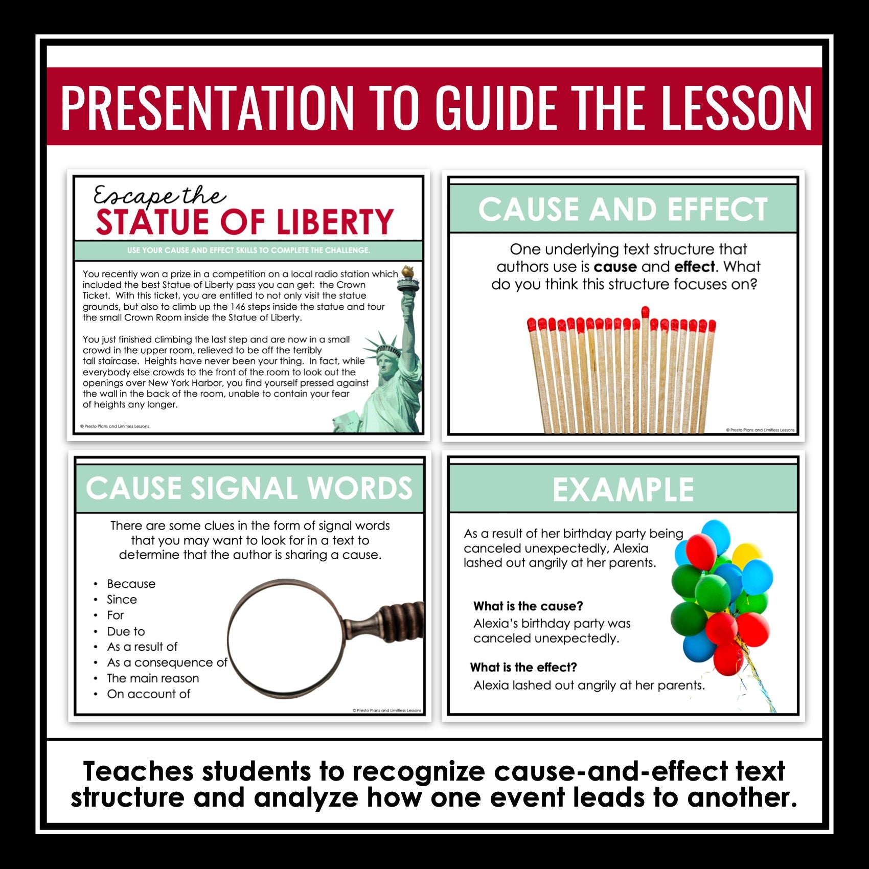 Cause and Effect Presentation & Nonfiction Escape Room Reading Activity: This cause and effect nonfiction text structure reading escape room style challenge is a new and fun way to engage your students and improve their understanding of cause and effect text structures in nonfiction! The detailed presentation introduces cause and effect text structures in nonfiction with clear examples of signal words that indicate whether an author is using either cause or effect. The highlight of the resource is the engaging escape room-style challenge, where students read an original narrative back story where they must escape a mysterious hidden room in the Crown Room at the top of the Statue of Liberty where they find themselves trapped. Then, they must collaborate in groups to crack a cause and effect-related challenge to solve "Frédéric’s Puzzle" and find the passphrase to escape!