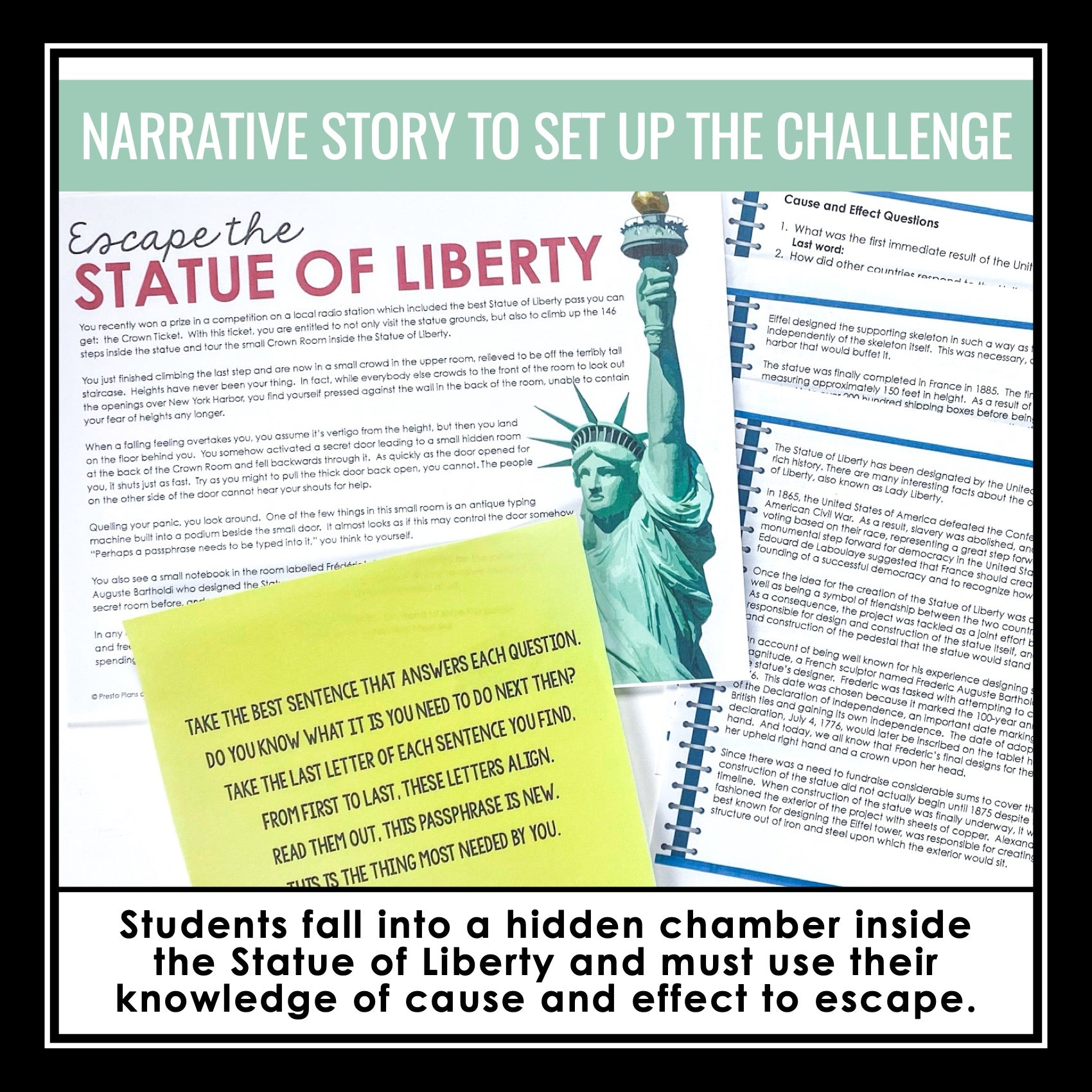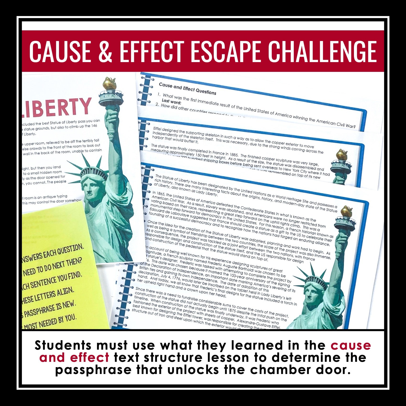 ➡️ Cause and Effect Escape Room Style Challenge: In this interactive escape-room style cause and effect nonfiction text structure challenge, students must read an original passage about the history of the Statue of Liberty and answer cause and effect questions to reveal a secret passphrase to escape the hidden room!