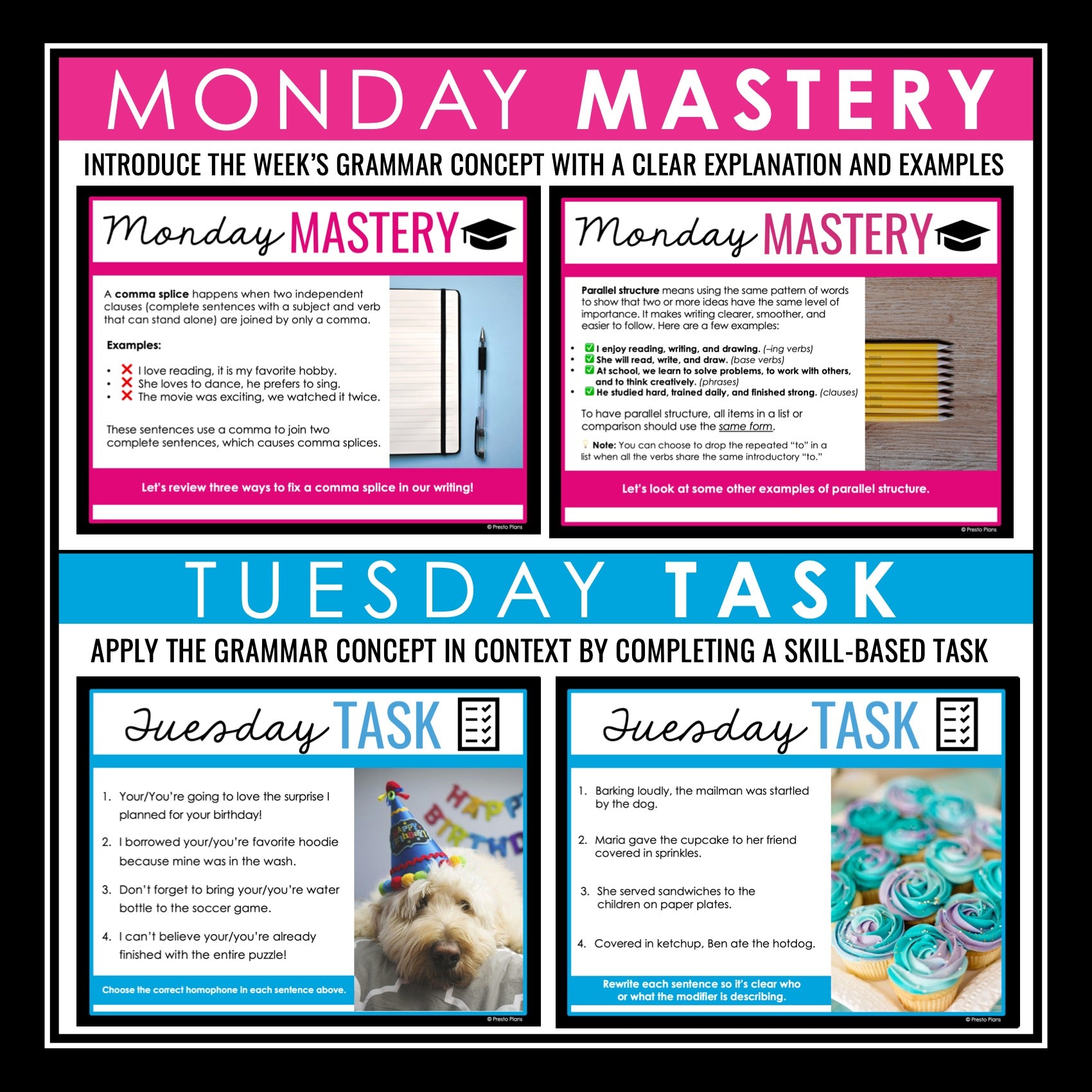 - Tuesday Task: Students apply the grammar concept in context by completing short, skill-based tasks, such as identifying errors, choosing the correct form, or rewriting sentences.