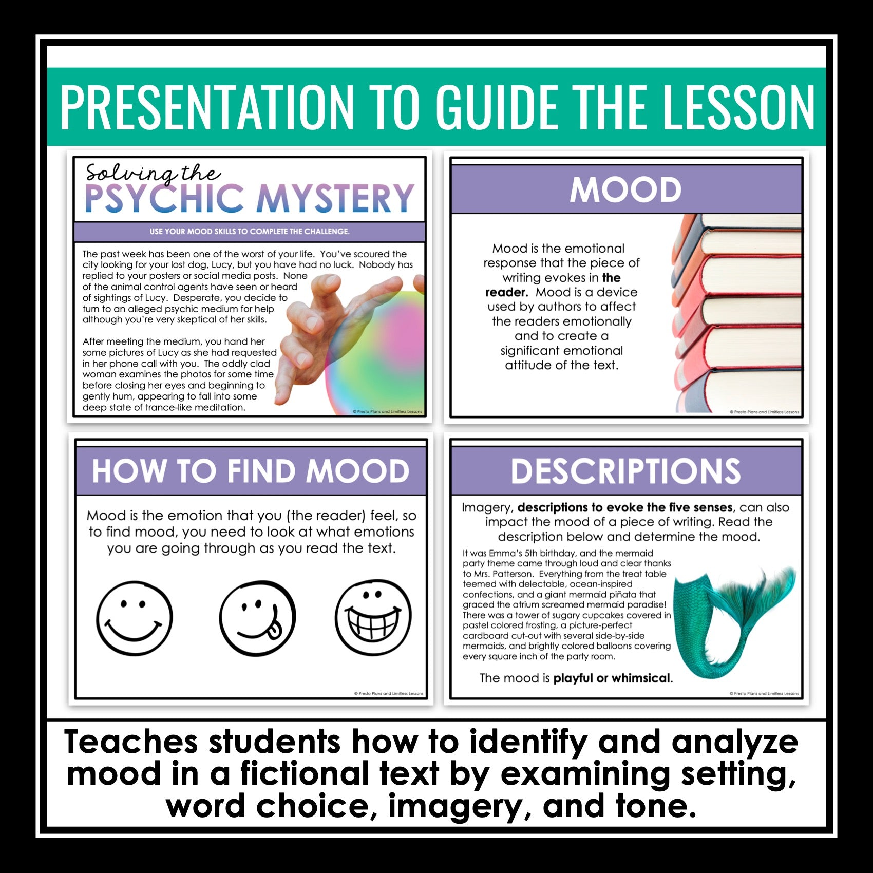 ➡️ Mood Presentation Slides: Use these PowerPoint presentation slides to guide the mood lesson and activity with instructional slides on how the mood of a text affects readers emotionally, and the impact specific elements and devices have on mood with examples. Also included are activity prompts, the narrative story text, story conclusion slides, and answer keys for review.