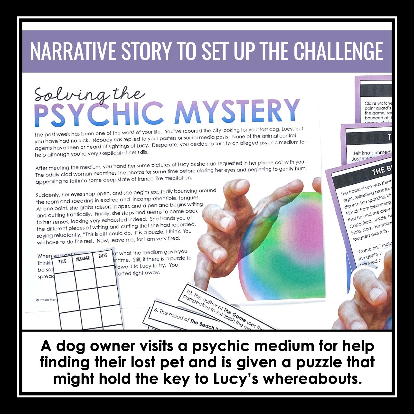 ➡️ Solve the Psychic Mystery Narrative Back Story: Next, students are ready to put what they have learned into action! They will begin the challenge by reading a short backstory that sets up the escape room challenge. Students, devastated by the loss of their dog Lucy, reluctantly consult a psychic medium for help; after a peculiar session, the medium provides them with pieces of writing, hinting at a puzzle to solve; determined to find Lucy, students diligently piece together the clues, hoping to unravel the mystery and reunite with their beloved pet.