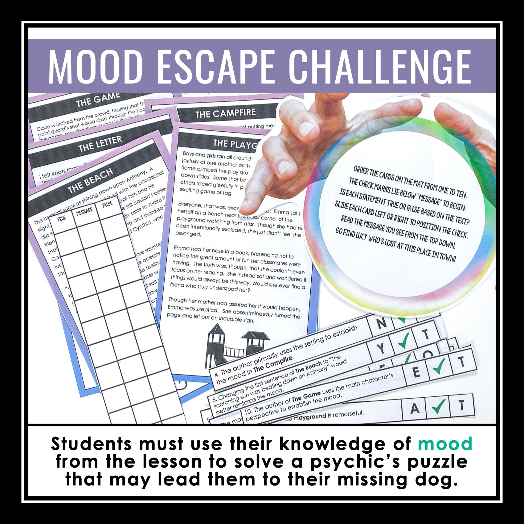 ➡️ Mood Escape Room Style Challenge: In this interactive escape-room style mood challenge, students must read an original short story, read a variety of texts, and solve a sliding puzzle using their knowledge of mood to get the location of their missing pet.