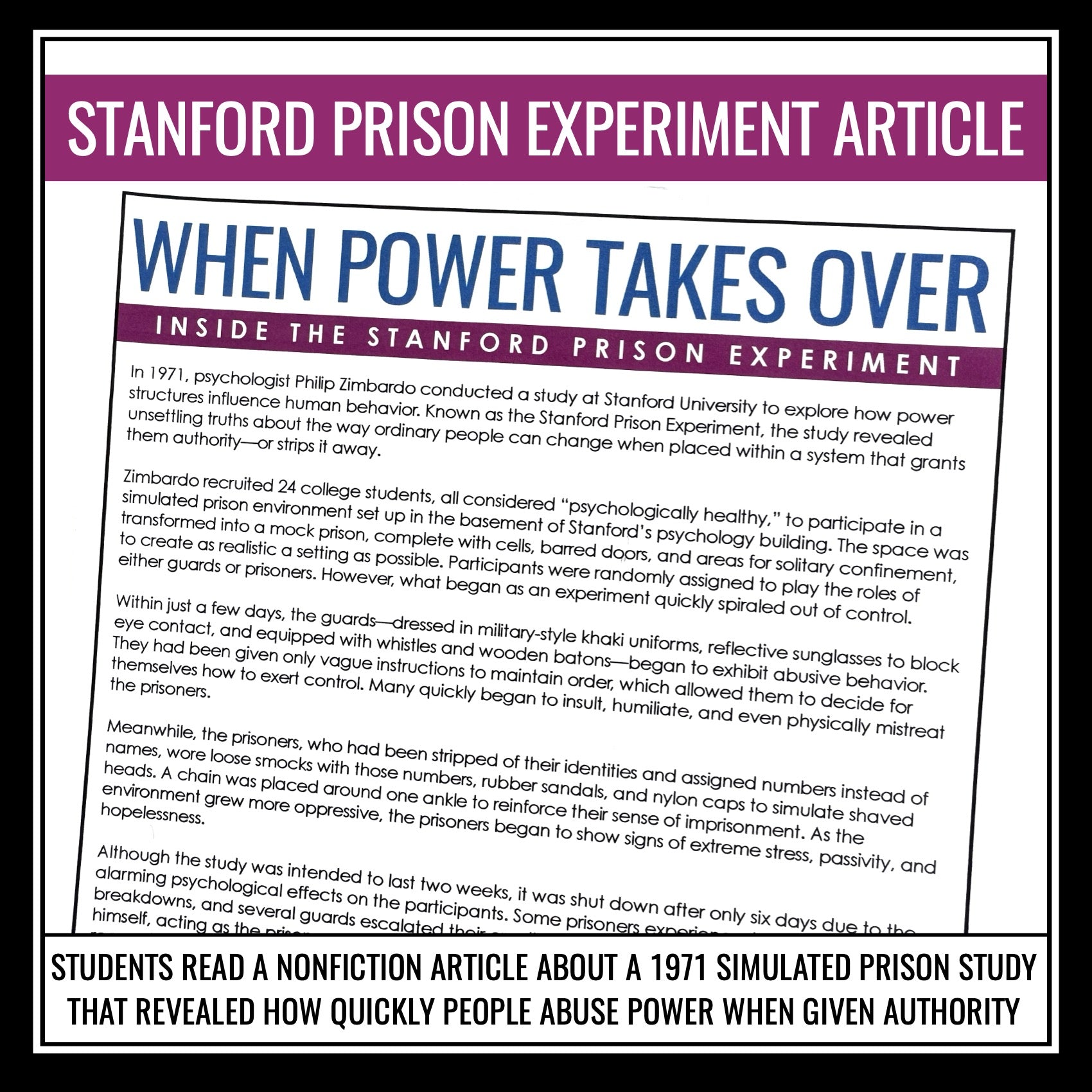 ➡️ Nonfiction Reading Article – The Stanford Prison Experiment: Students read a nonfiction article explaining the experiment. It outlines how quickly people can adopt abusive roles when given power, offering essential background for the literary connection to Night by Elie Wiesel.
