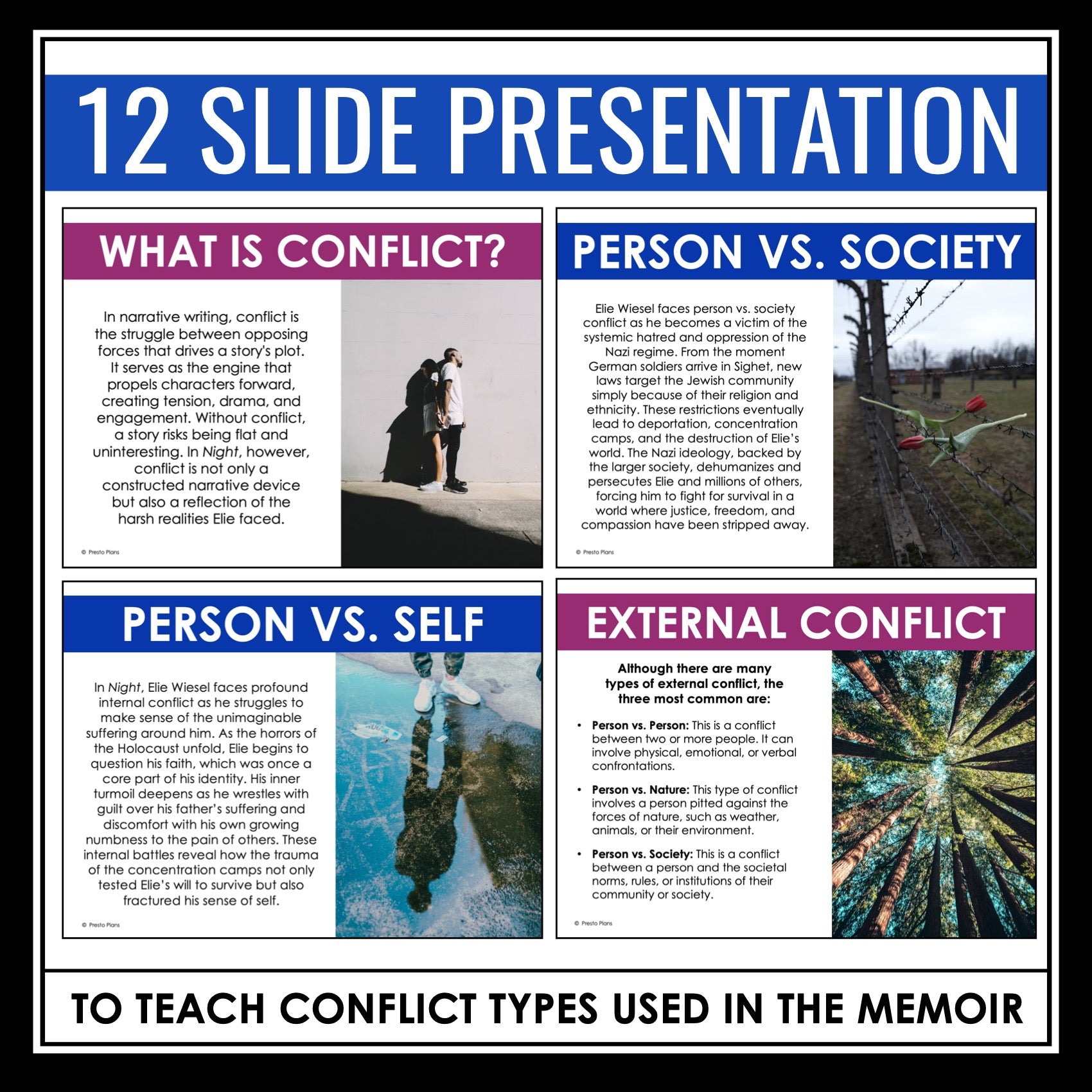 ➡️ Night Conflict Presentation Slides: Use this 12-slide PowerPoint presentation to introduce students to the different types of conflict and connect them directly to events in Night by Elie Wiesel. The slideshow provides definitions, explanations, and compelling examples from the memoir to support comprehension and spark class discussion.