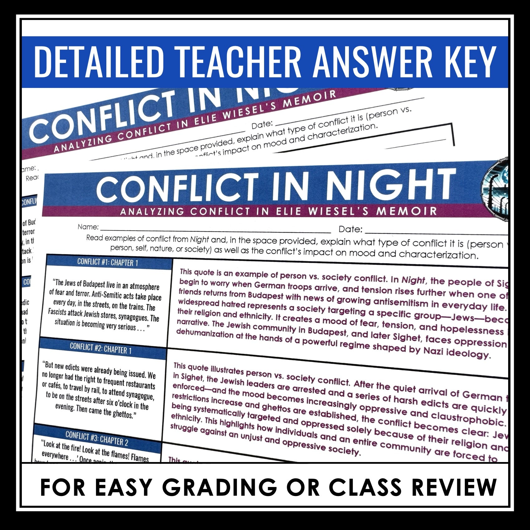 ➡️ Night Conflict Student Assignment: In this assignment, students examine powerful quotes pulled directly from throughout the memoir, determine the type of conflict, and analyze how each shapes mood and character development. The assignment includes examples organized by chapter, giving students a structured, chronological approach to tracking conflict throughout the book.