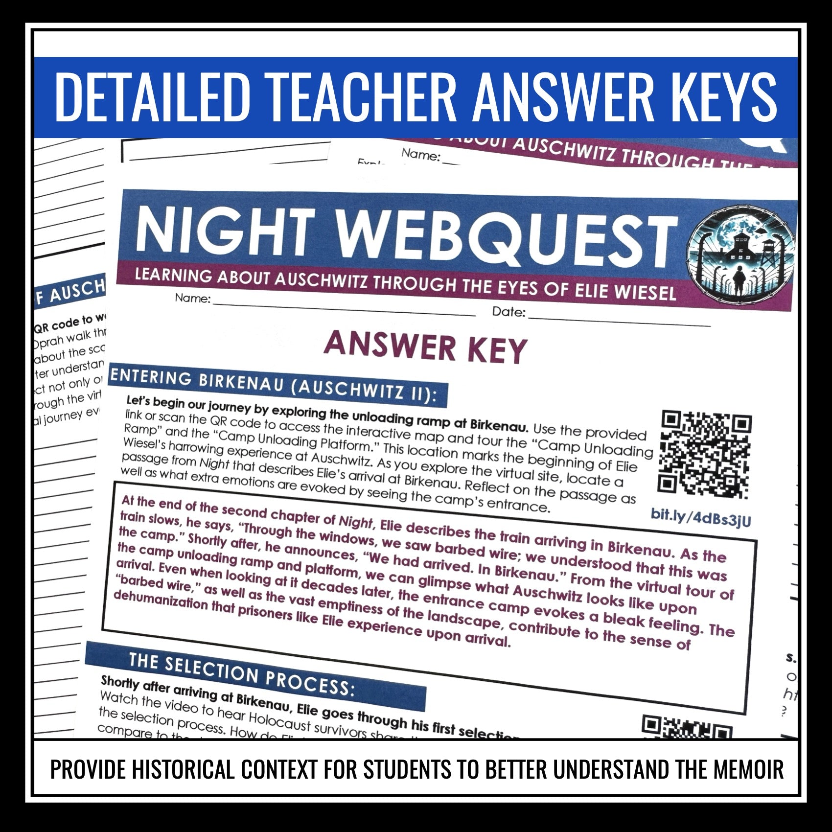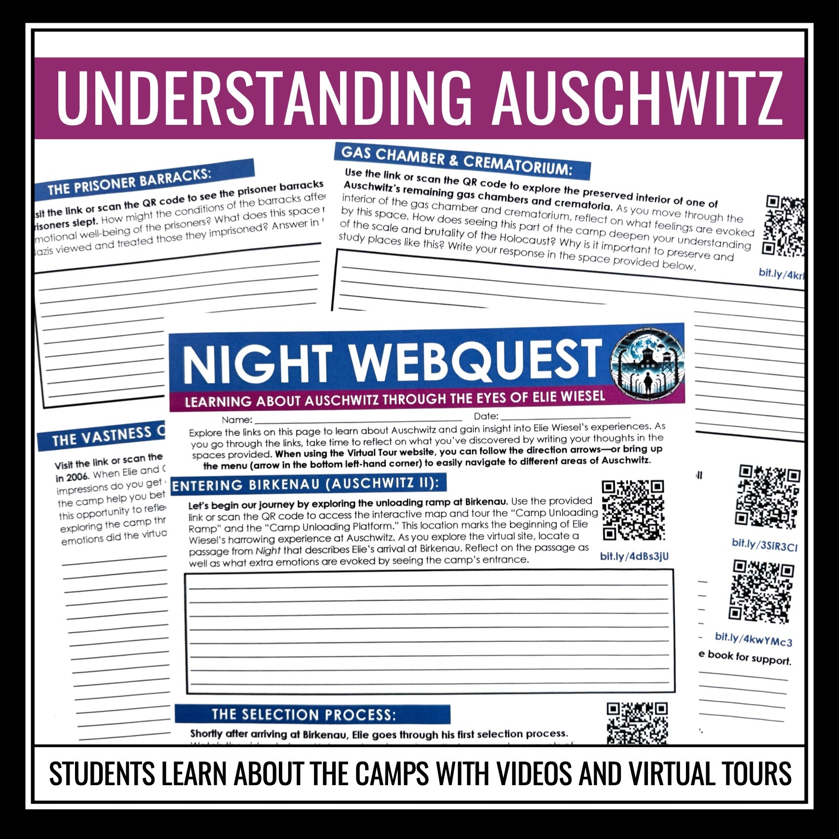 ➡️ Night WebQuest Assignment: A comprehensive, ready-to-use webquest that walks students through key locations at Auschwitz using direct web links and QR codes. Students visit high-quality online resources, including a virtual tour of Auschwitz-Birkenau, a video of Elie Wiesel returning to the site with Oprah Winfrey, survivor interviews, and more. Each section includes guiding questions that require students to connect the virtual content to moments in Night, survivor testimony, and personal reflections.