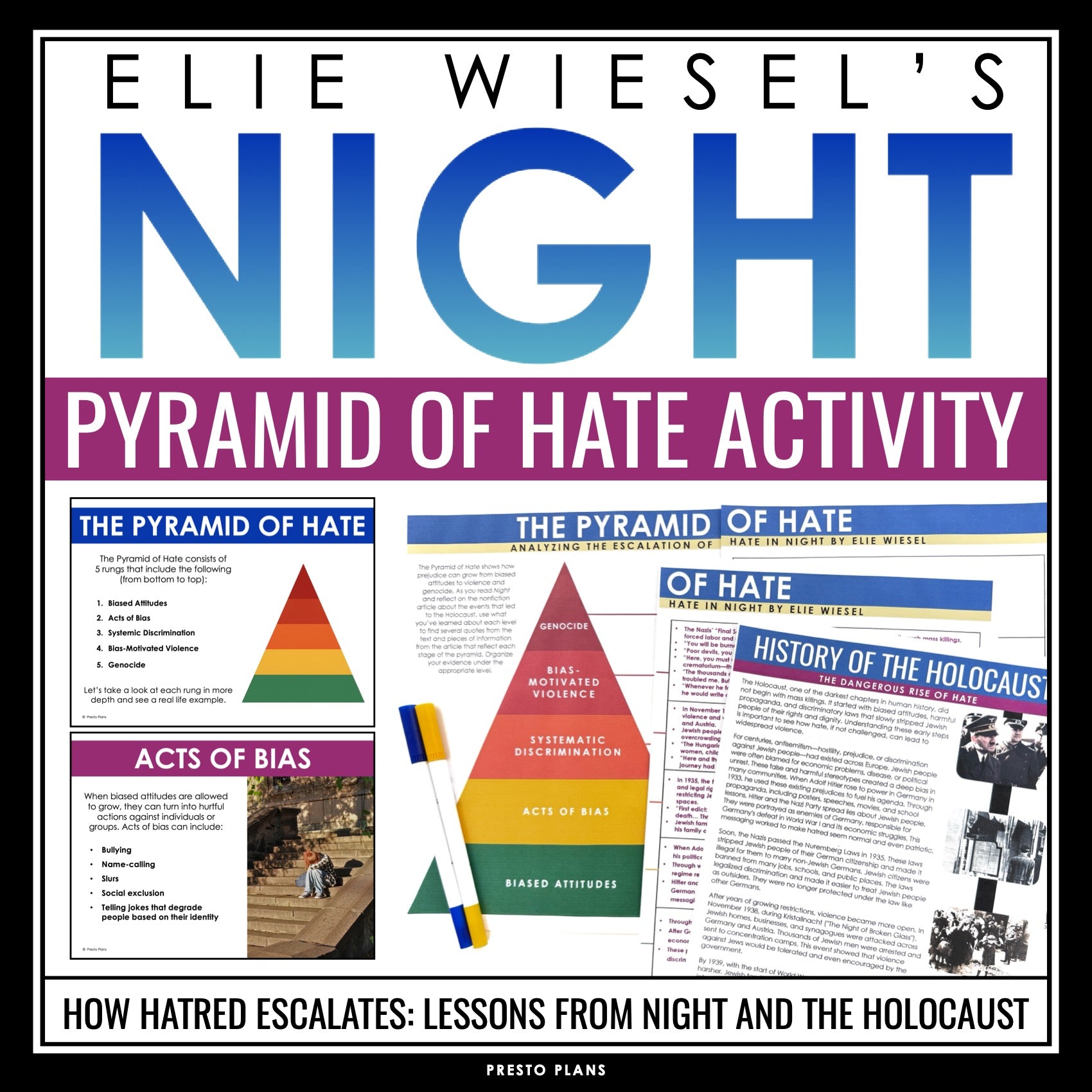 Night by Elie Wiesel Activity - Pyramid of Hate Slides, Article and Assignment: Help students understand how prejudice escalates with this impactful Pyramid of Hate activity designed to deepen their historical and literary analysis of Night by Elie Wiesel. Using the Anti-Defamation League’s Pyramid of Hate as a framework, students examine how bias—left unchecked—can build from small acts of discrimination to systemic violence and genocide. Paired with a nonfiction article on the history of the Holocaust, this Night activity gives students the tools and resources to make powerful connections between Night by Elie Wiesel and real-world history.