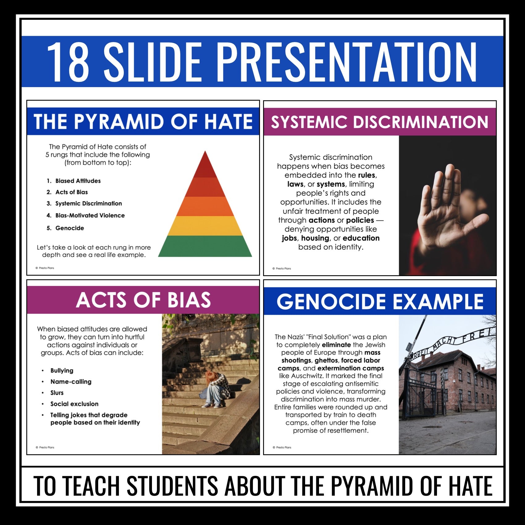 ➡️ Pyramid of Hate Presentation Slides: Introduce students to the Pyramid of Hate with this 18-Slide PowerPoint presentation with definitions and real-world examples at each level—from biased attitudes to genocide. The presentation directly connects to events in Night by Elie Wiesel, helping students visually and conceptually understand how small acts of hate can evolve into large-scale atrocities.