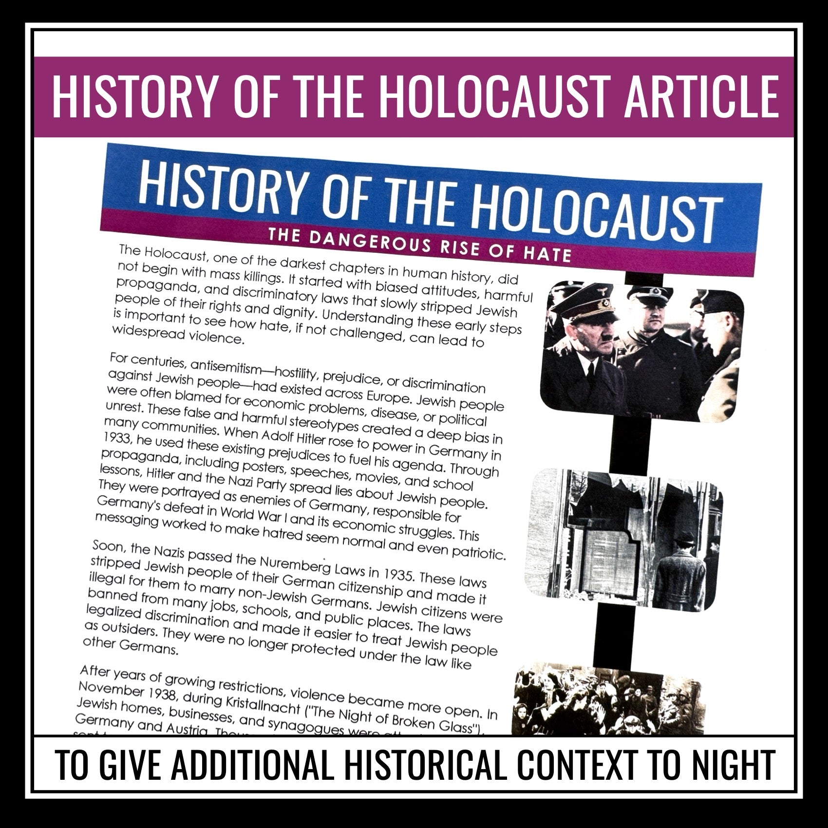 ➡️ Nonfiction Article – History of the Holocaust: This student-friendly article outlines the historical rise of antisemitism and the systemic persecution that led to the Holocaust. The reading provides essential background knowledge to support the analysis activity and strengthen historical context.