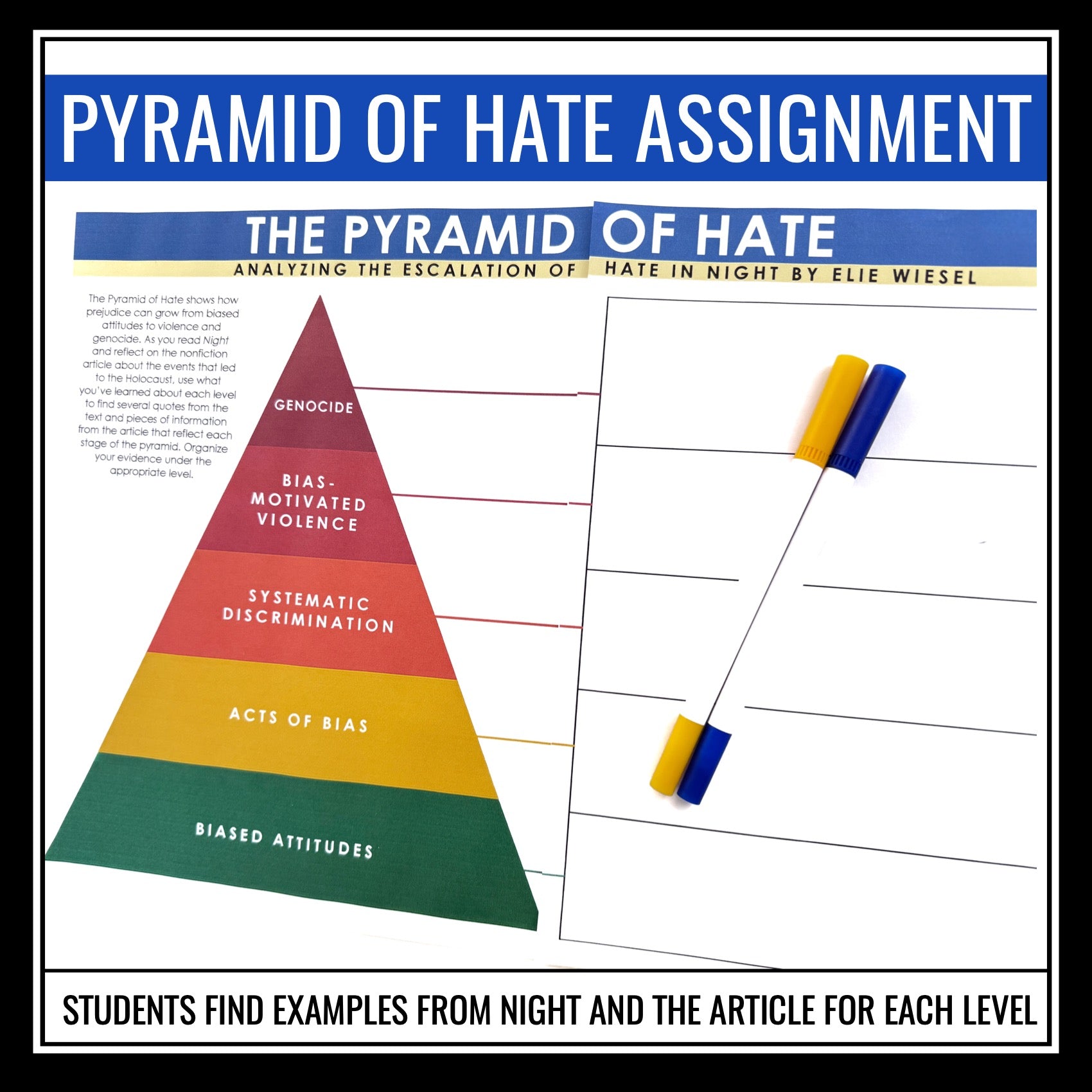➡️ Night Pyramid of Hate Student Assignment: Students apply their knowledge by finding quotes from Night and facts from the article that correspond to each level of the pyramid. This organizer helps students trace the escalation of hate across the memoir and history, encouraging critical thinking and empathy.