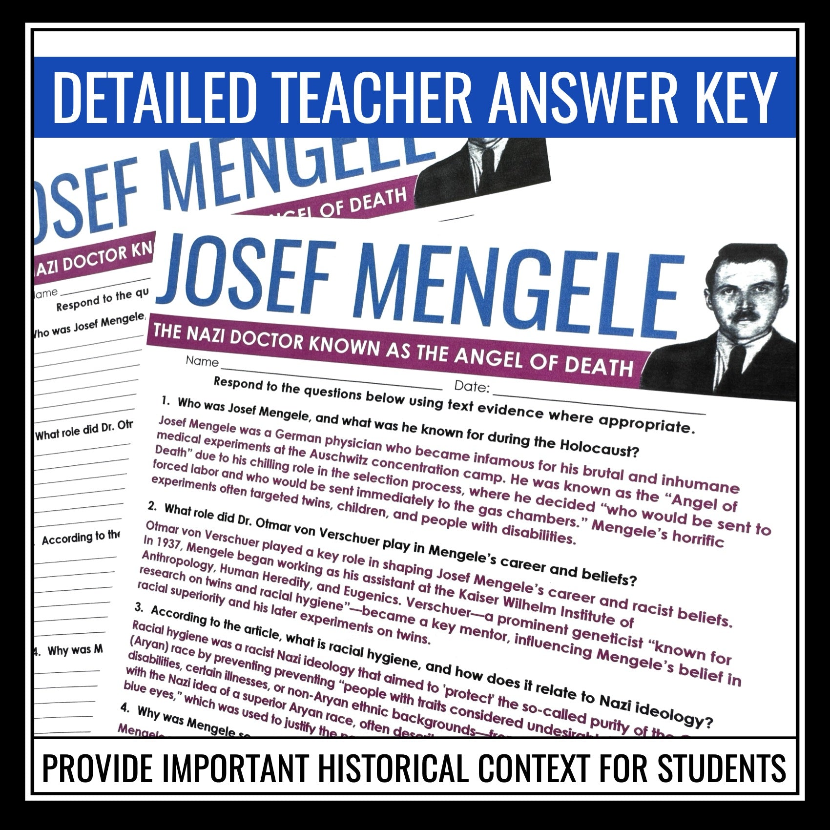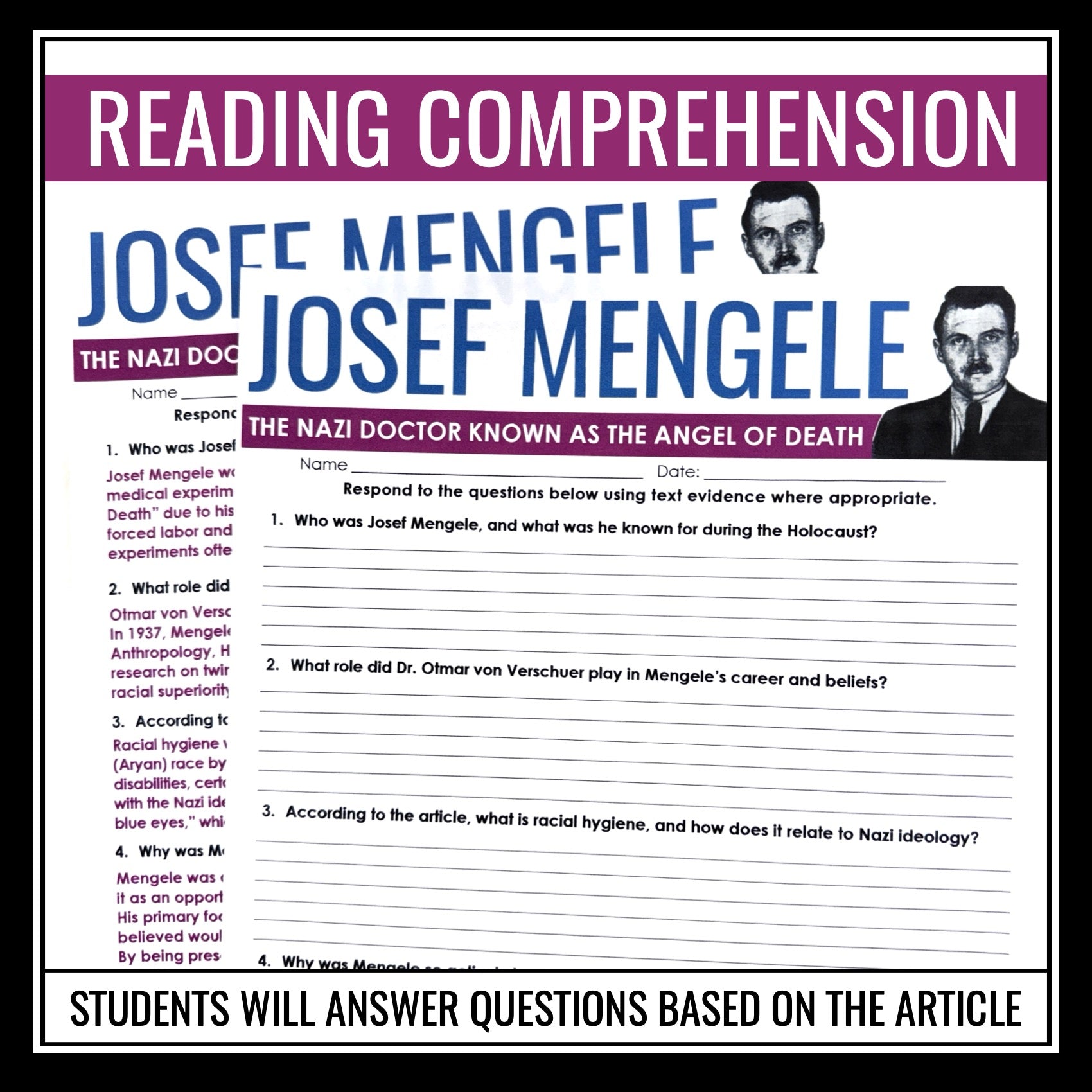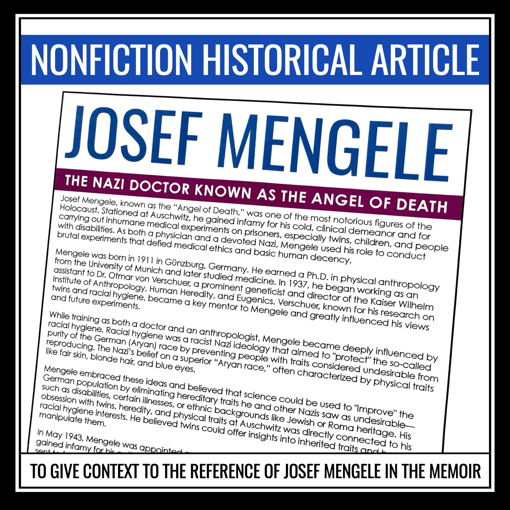 Use this historical context lesson during your unit for Night by Elie Wiesel to teach students about one of the most infamous figures of the Holocaust, Josef Mengele, the Nazi doctor known as the “Angel of Death.” This nonfiction article gives historical background on Mengele’s education, ideology, medical experiments at Auschwitz, and eventual escape from justice. Paired with a set of thoughtful comprehension questions, the Josef Mengele Night activity encourages students to analyze a nonfiction text, connect it to Night by Elie Wiesel, and reflect on the moral consequences of unchecked power. This is best used after students have read chapter 5 of the memoir, where Elie reflects on Josef Mengele’s presence.
