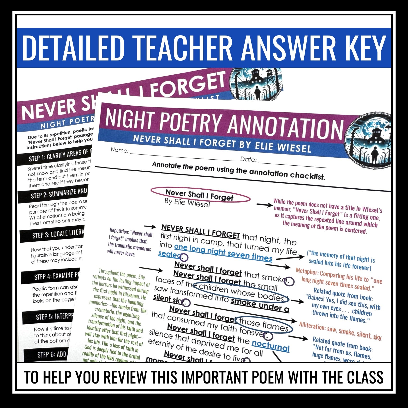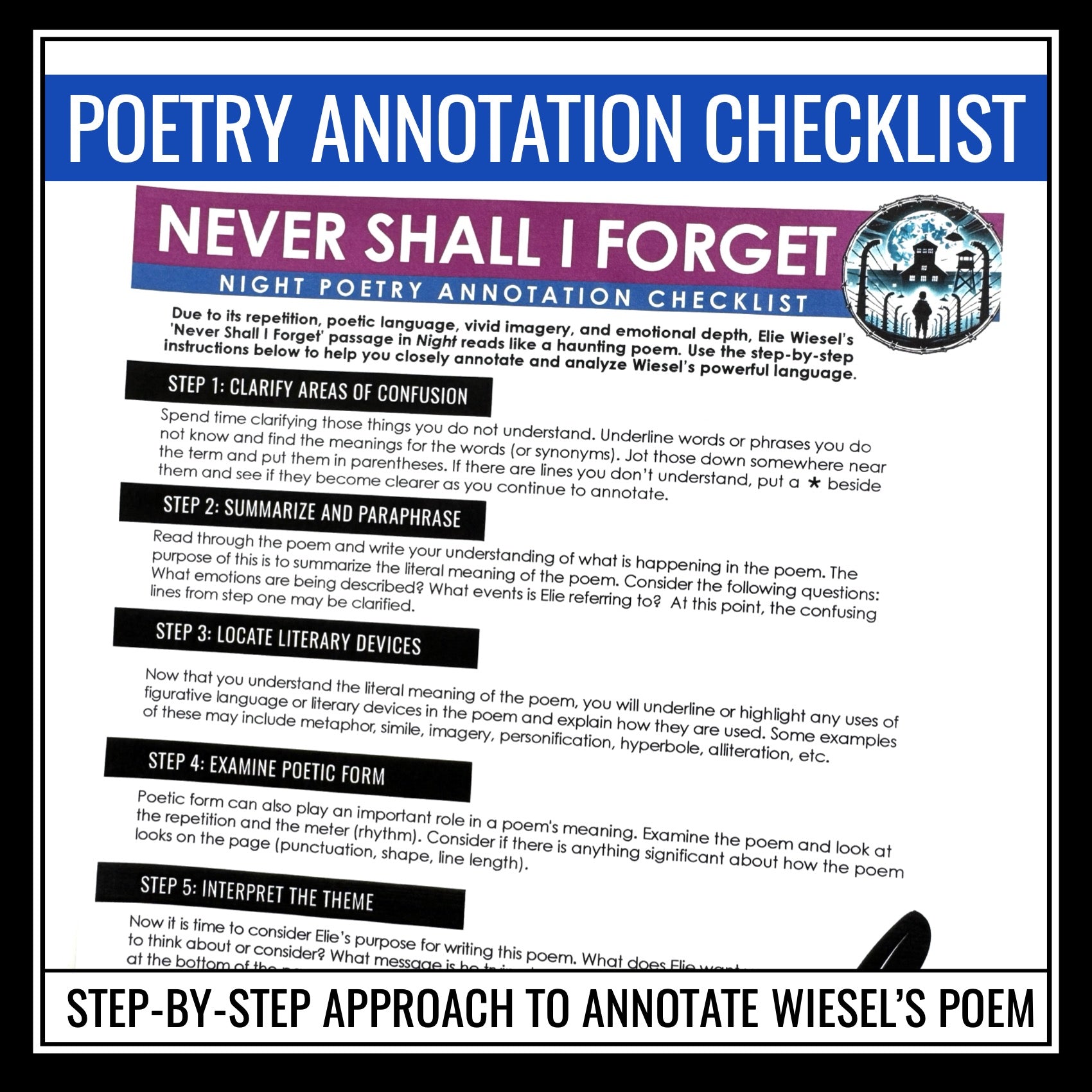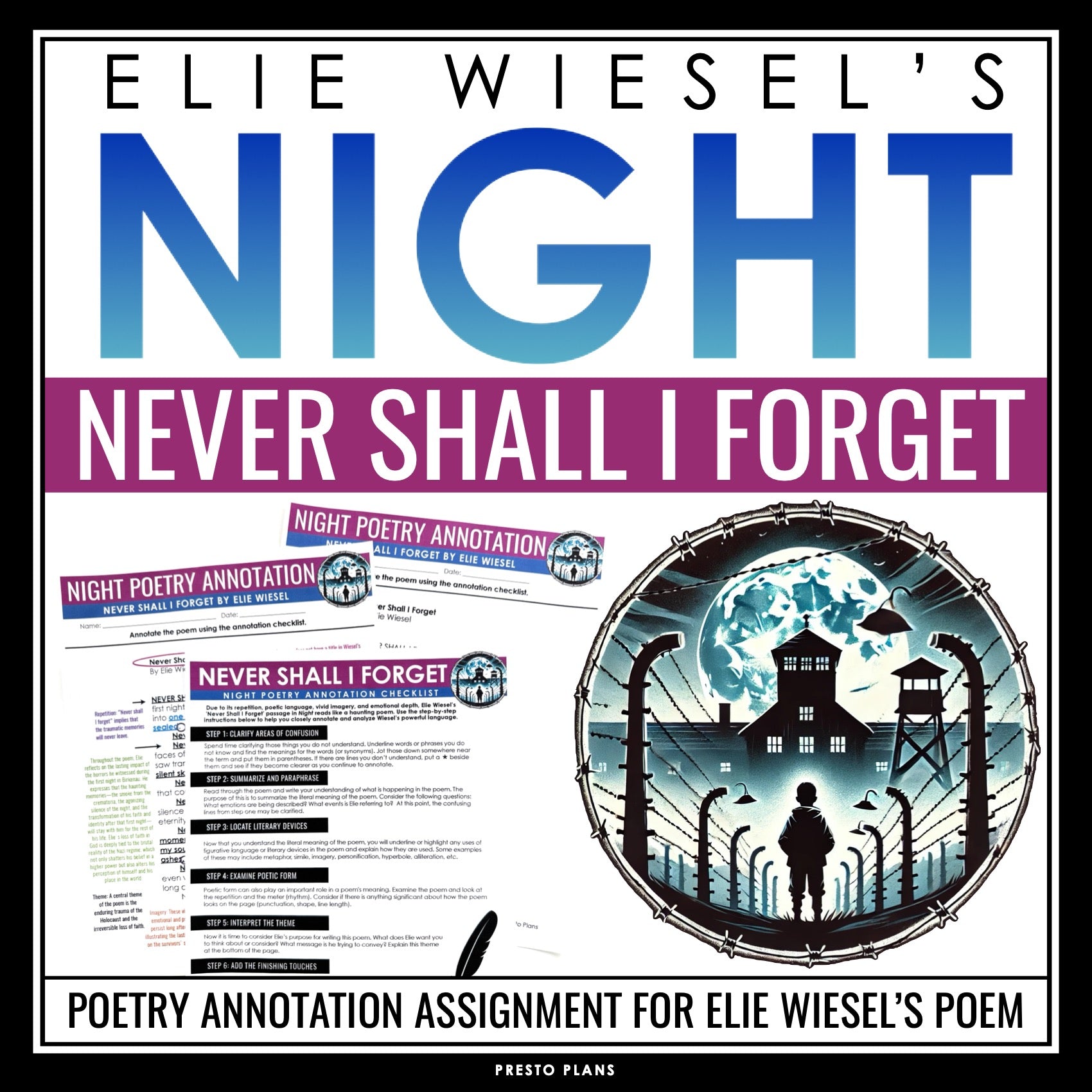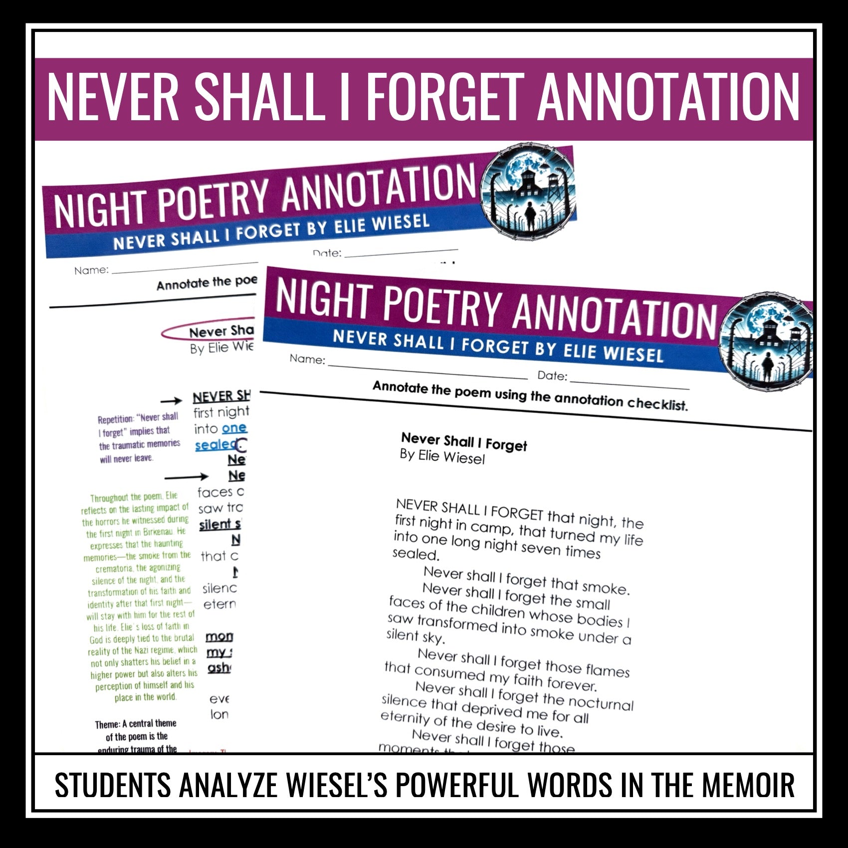 Night by Elie Wiesel Poetry Analysis Assignment - Never Shall I Forget Poem: Night by Elie Wiesel includes a haunting poetic passage, and this lesson allows students to understand it more deeply with a close reading and poetry annotation activity. Although not written as a standalone poem, the famous “Never Shall I Forget” section of Night by Elie Wiesel allows students to examine its meaning along with literary devices and figurative language. This resource guides students through a detailed analysis of Wiesel’s language and structure as they annotate the poem using a step-by-step checklist. Students explore meaning, emotion, form, and connection to the memoir while deepening their understanding of the trauma and lasting psychological impact of the Holocaust. This lesson works best after students have read chapter 3, where the passage appears.