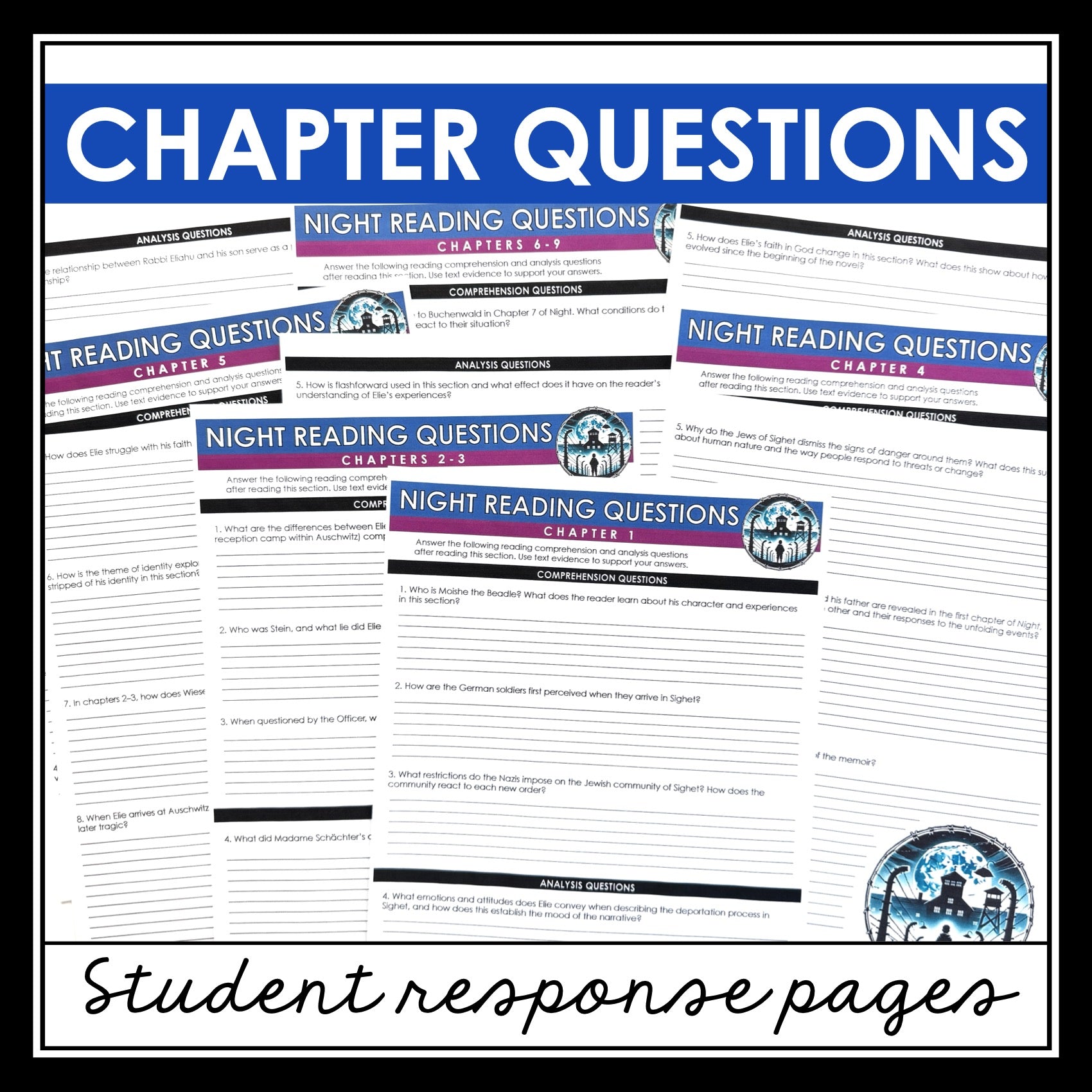 ➡️ Night Questions Student Response Pages: Organized by chapter sets, these student response pages include each of the questions with a space for students to write their answers. Simply print the pages, distribute them to your students, and you are ready to go!