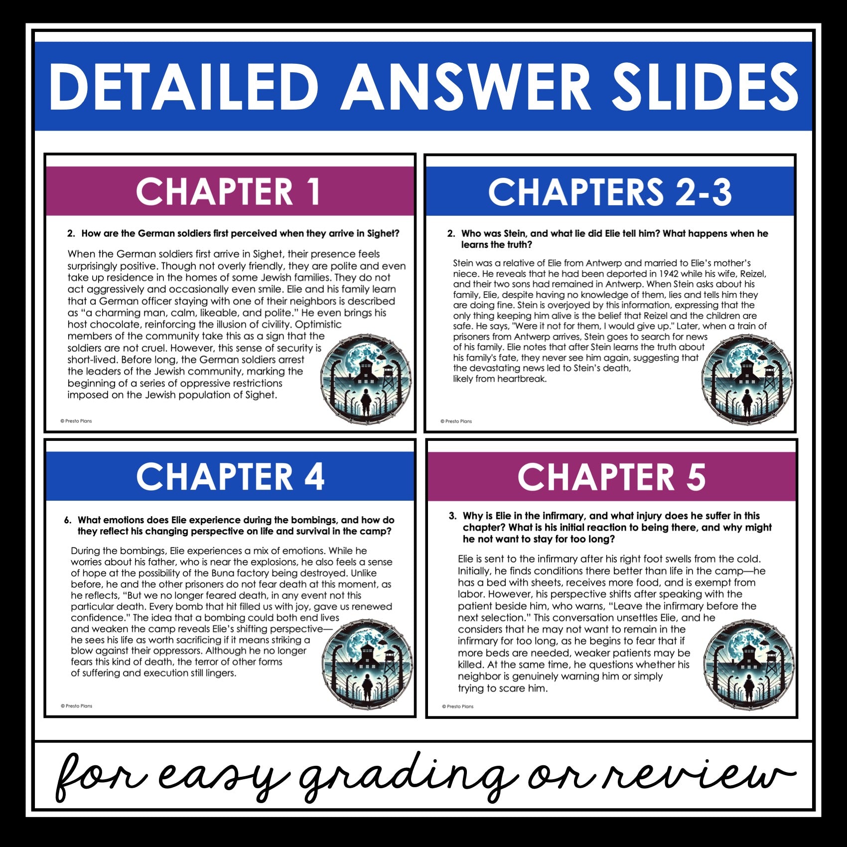 ➡️ Night Questions Presentation Slides: This PowerPoint presentation includes each of the reading chapter questions for Night by Elie Wiesel as well as detailed answer keys. The answers include text evidence and quotes, so they are an excellent way to review the answers as a whole class.