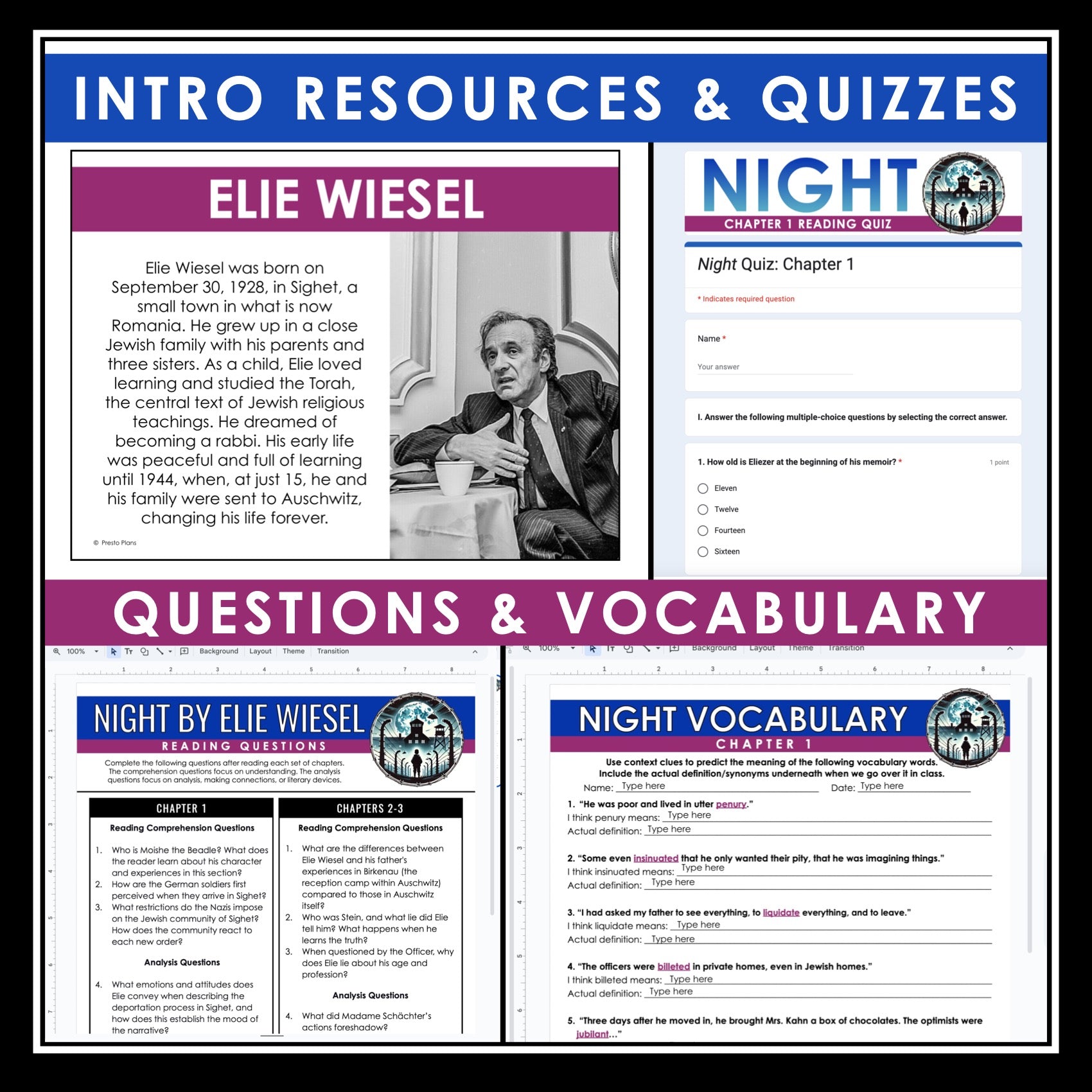 ➡️ Night Introductory Presentation: Introduce the memoir with this interactive Google Slides presentation. It includes pre-reading discussion questions, an interactive class activity, a biography of Elie Wiesel, historical and social context, and background information on the memoir. The presentation sets the stage for the entire unit.