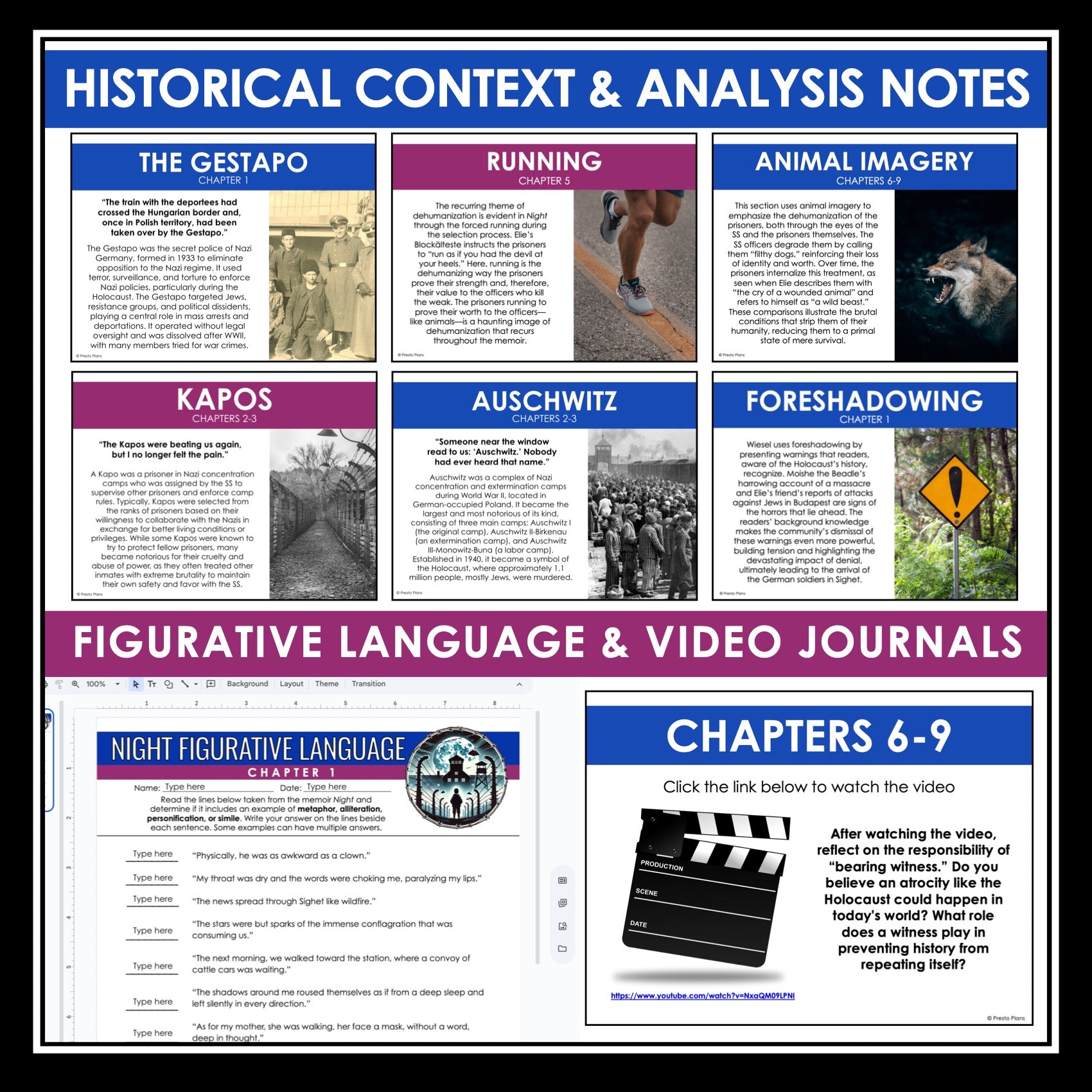 ➡️ Night Figurative Language Assignments: This resource will help your students examine the figurative language used in Night by Elie Wiesel. These five digital assignments include quotes from the memoir that students must label with the correct figure of speech used. The assignments are broken down into chapter sets and include detailed answer keys for easy grading or class review.