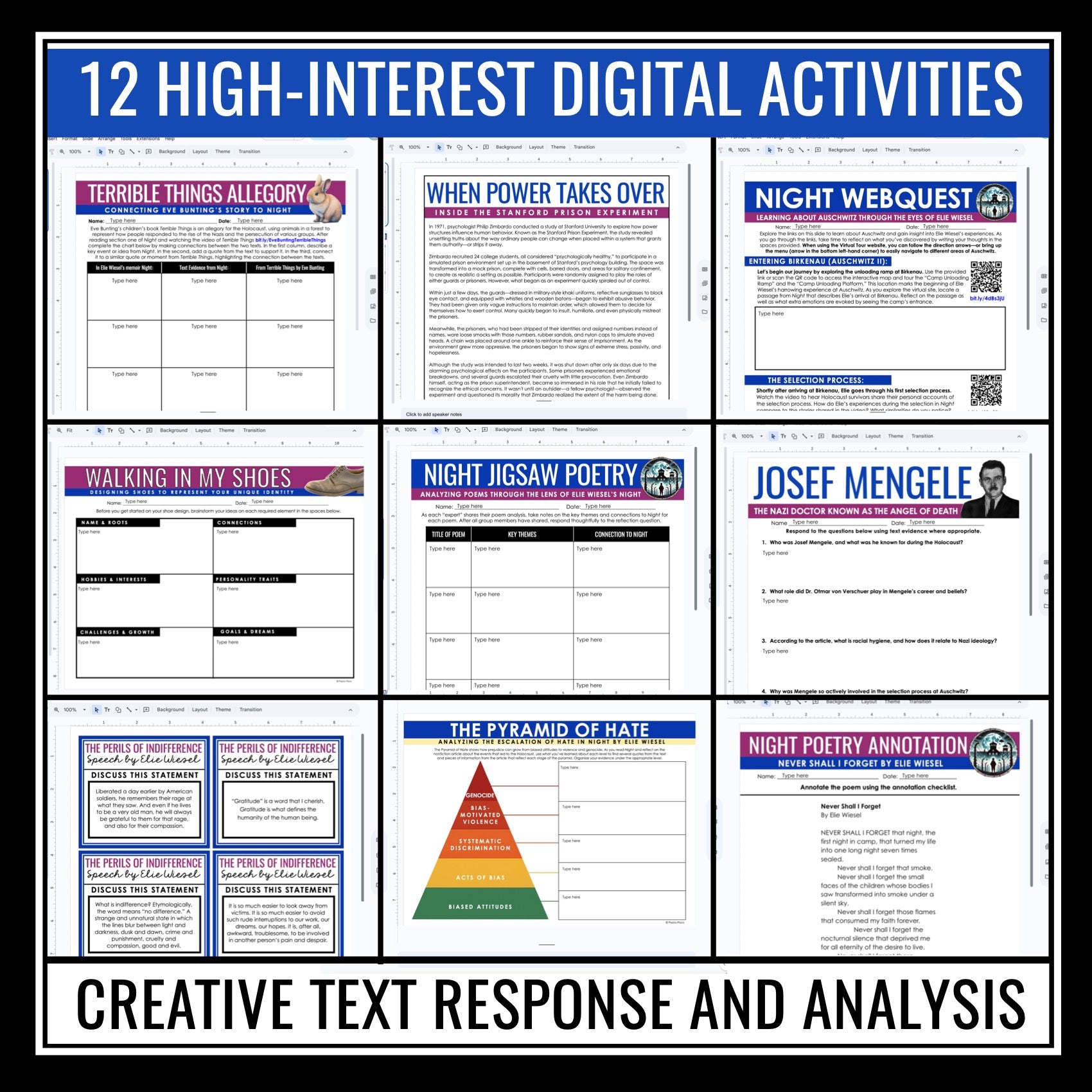 Night by Elie Wiesel Unit Plan - Novel Study Memoir Reading Unit - Digital: This all-in-one digital unit plan provides everything you need to teach Night by Elie Wiesel in your classroom. With over 400 digital slides of content, this ready-to-use resource ensures no prep time is required! This unit includes a variety of engaging digital materials to enhance your students' understanding and appreciation of Night’s historical significance, powerful character experiences, and universal themes. You’ll find interactive presentation slides, digital assignments, historical context exploration, thought-provoking reading questions, vocabulary activities, quizzes, video journals, and hands-on interactive digital activities. This comprehensive digital Night unit plan is designed to create a rich learning experience while making lesson planning simple and stress-free for teachers.