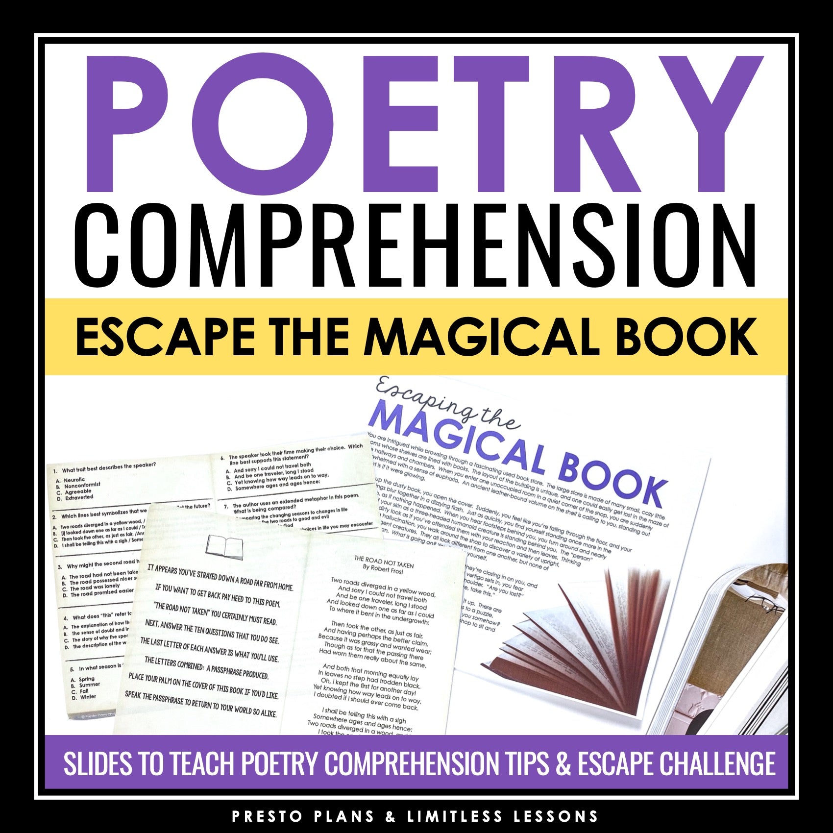 Poetry Reading Comprehension Slides & Escape Room Poem Reading Activity: This poetry comprehension reading escape room style challenge is a new and fun way to engage your students and improve their understanding of poetry! The detailed presentation introduces tips for improving poetry comprehension, ensuring student understanding from the start. The highlight of the resource is the engaging escape room-style challenge, where students read an original narrative back story where they must escape a magical book. Then, they must collaborate in groups to crack a poetry comprehension-related challenge to unlock the solution and find the passphrase to escape the book!
