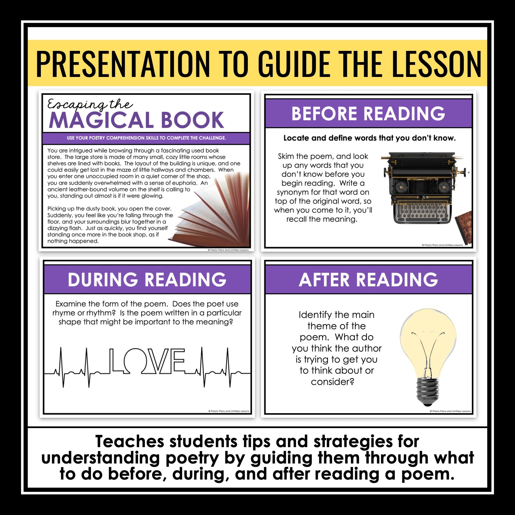 ➡️ Poetry Comprehension Presentation Slides: Use these PowerPoint presentation slides to guide the poetry comprehension lesson and activity with instructional slides with tips for understanding poetry. Also included are activity prompts, the narrative story text, story conclusion slides, and answer keys for review.