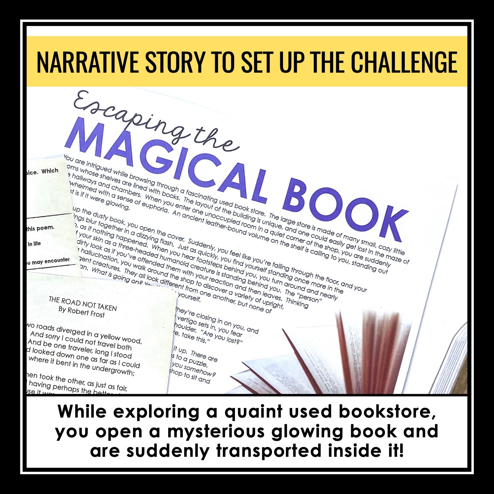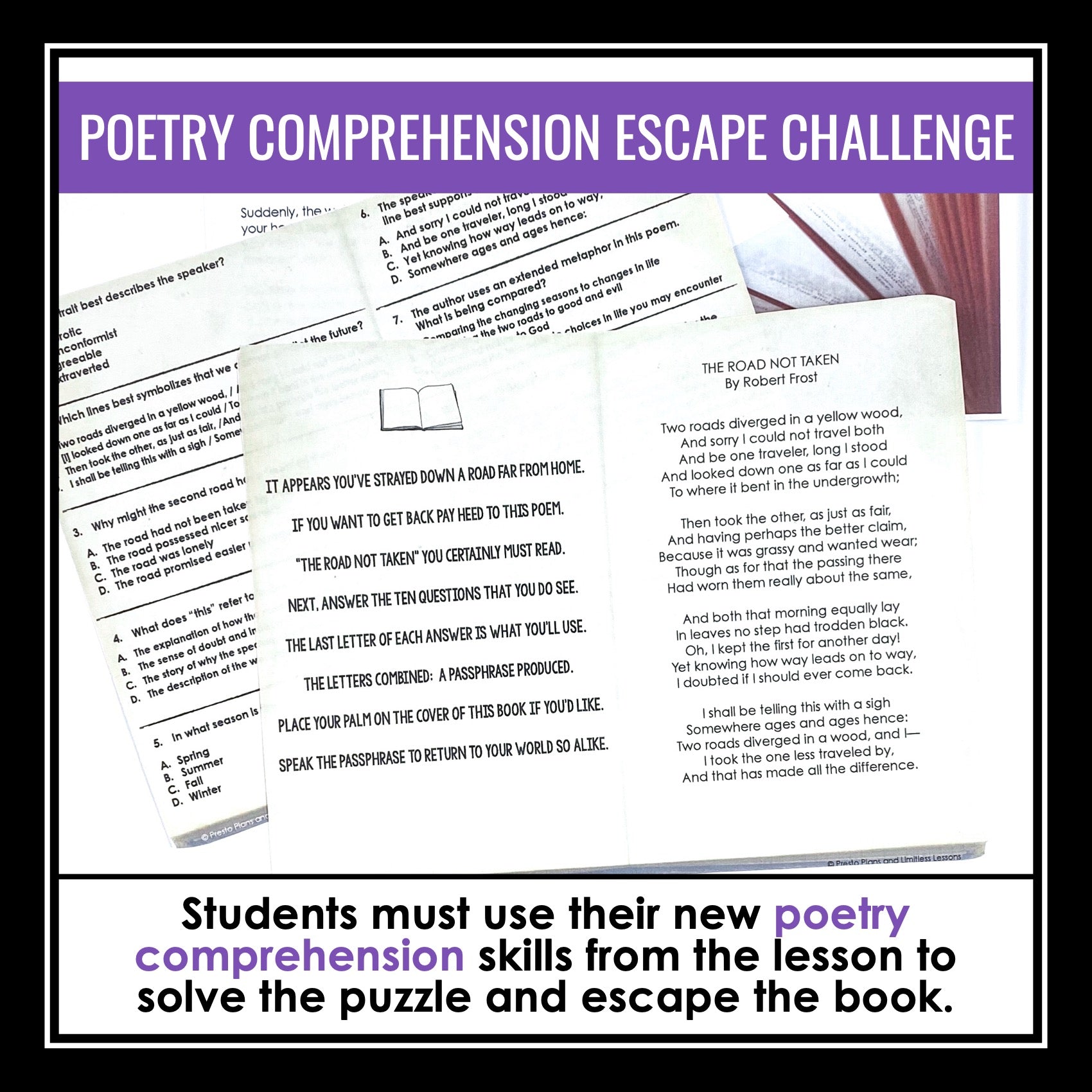 ➡️ Poetry Comprehension Escape Room Style Challenge: In this interactive escape-room style poetry comprehension challenge, students must read a poem (The Road Not Taken by Robert Frost) and answer multiple-choice questions to show understanding to reveal a hidden passphrase to escape the book.