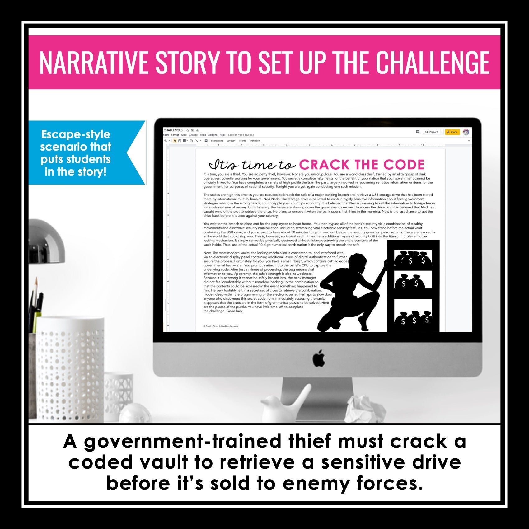 ➡️ Crack the Safe Narrative Back Story: Next, students are ready to put what they have learned into action! They will begin the challenge by reading a short backstory that sets up the escape room challenge. As a government-trained thief, students are tasked with retrieving a USB drive containing sensitive information from a bank vault before it's used against their country. They must decipher the clues and retrieve the USB drive in the safe before the security guard returns!