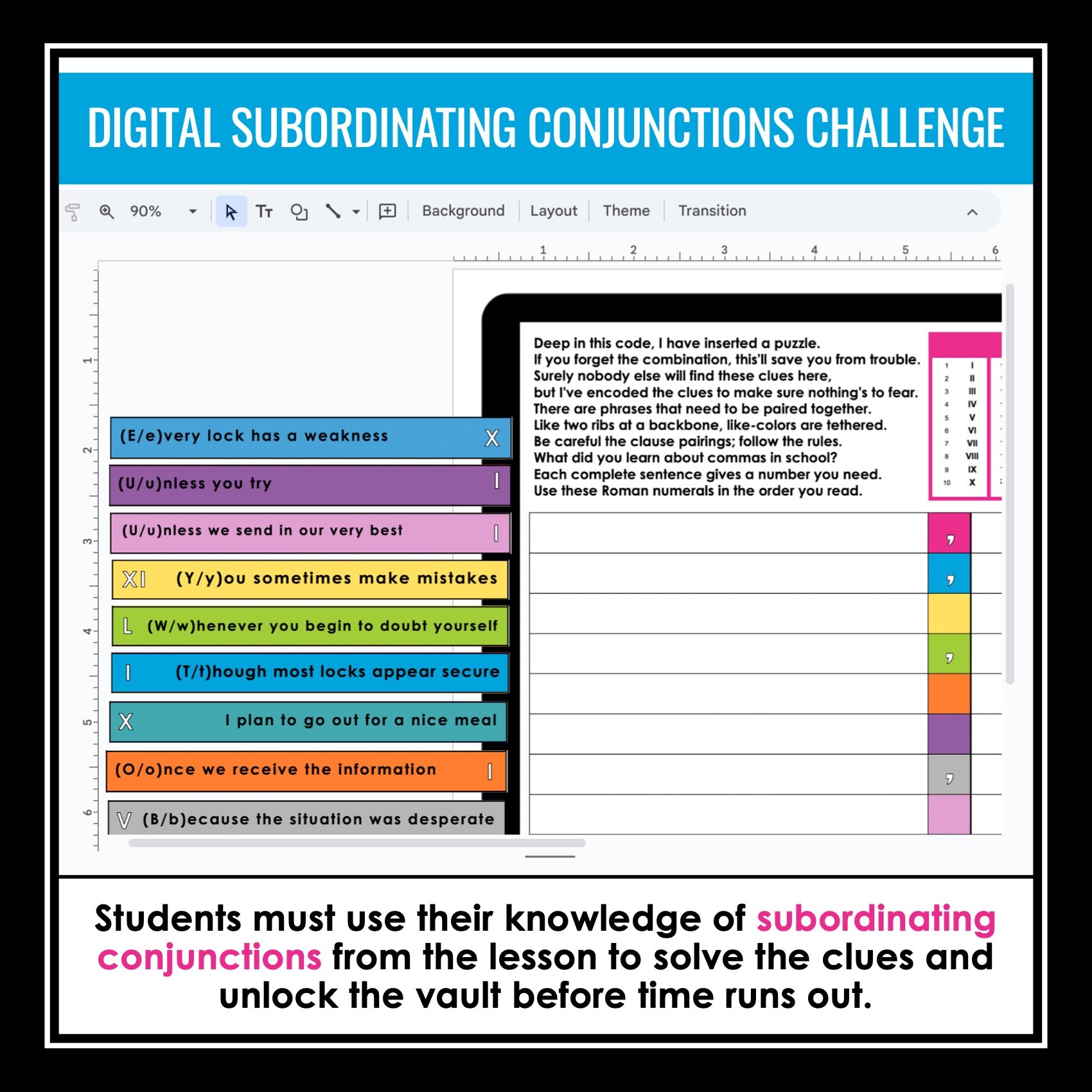 ➡️ Subordinating Conjunctions Digital Escape Room Style Challenge: In this interactive escape-room style subordinating conjunctions challenge, students must place strips of paper with clauses into their correct location to unveil a passphrase to open the safe!