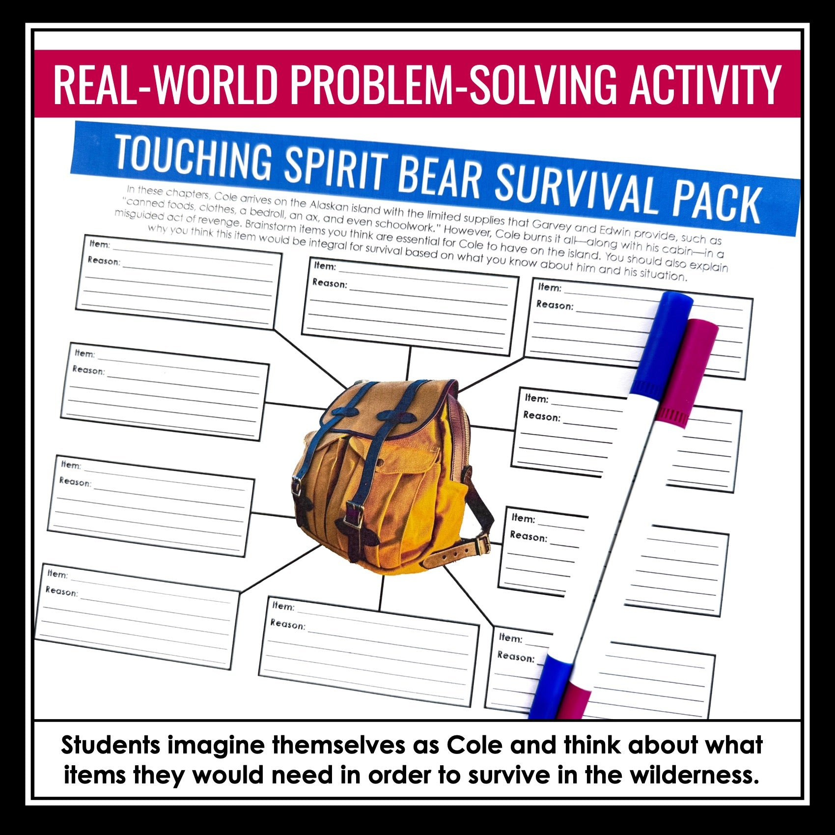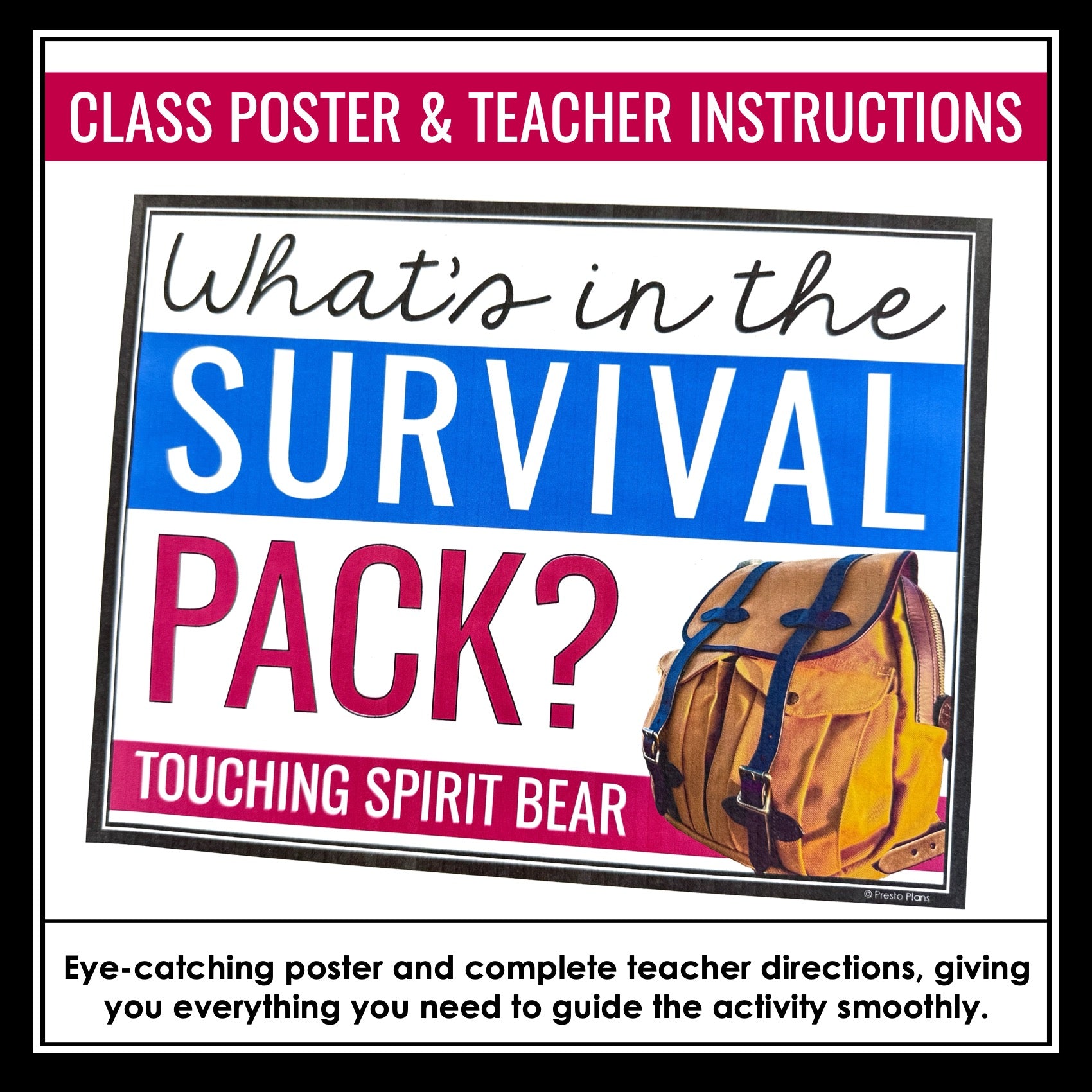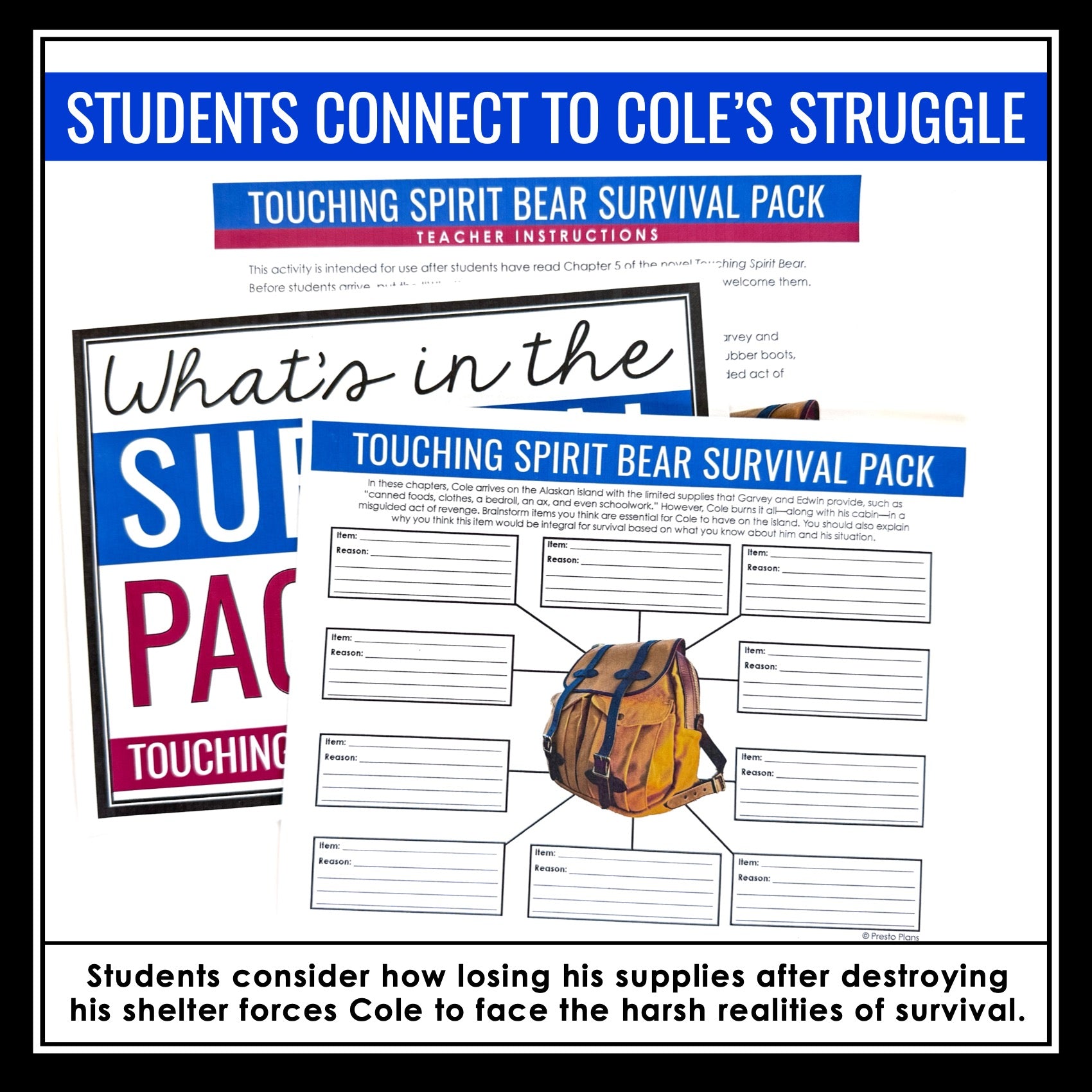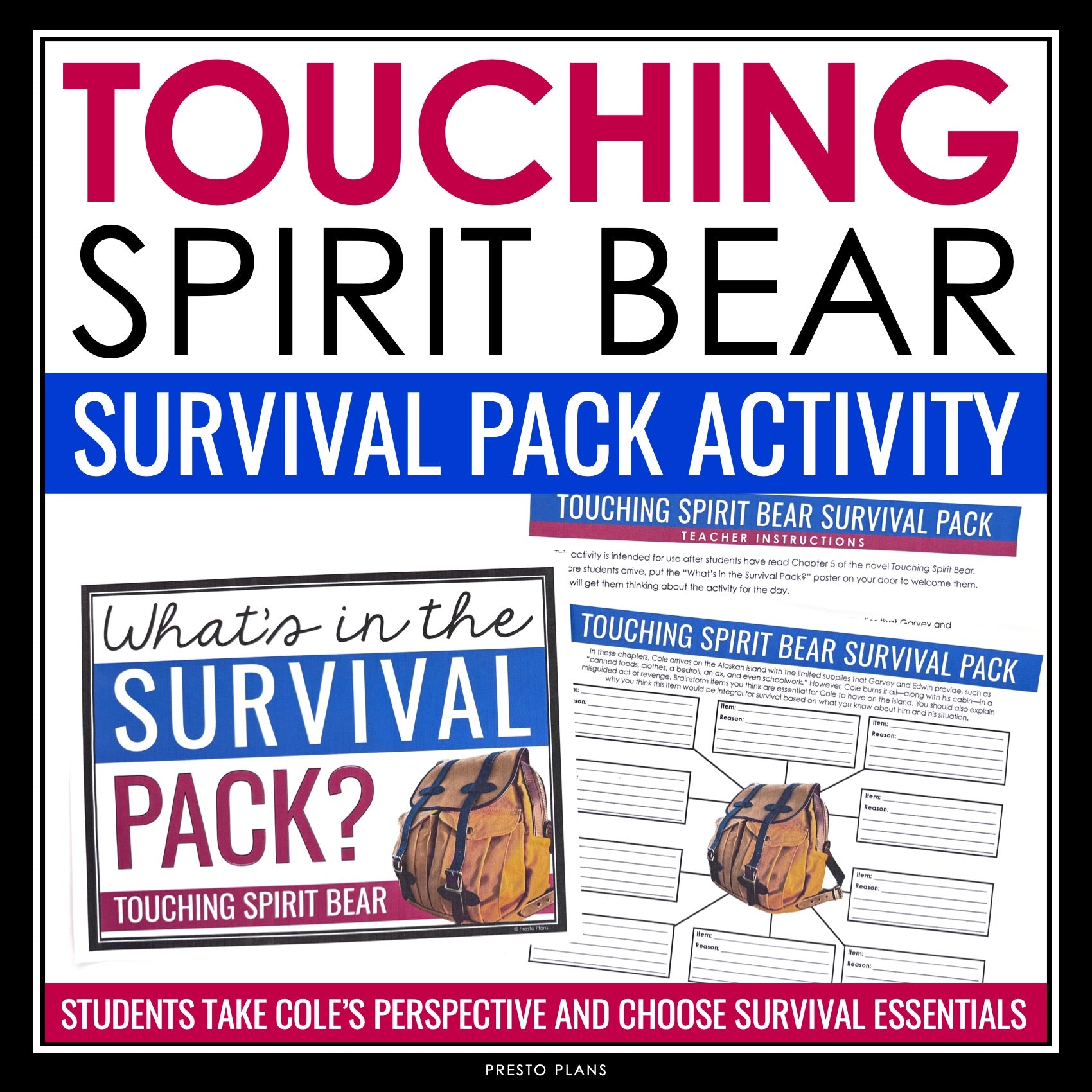Touching Spirit Bear Activity - Survival Pack Creative Novel Study Assignment: Engage your students with this creative Touching Spirit Bear survival activity that brings Cole Matthews’ struggle to life. In this assignment, students imagine what it would take to survive on the remote Alaskan island after Cole destroys his supplies in anger. Students step into Cole’s perspective, choose which items they believe are essential for survival, and justify their reasoning.