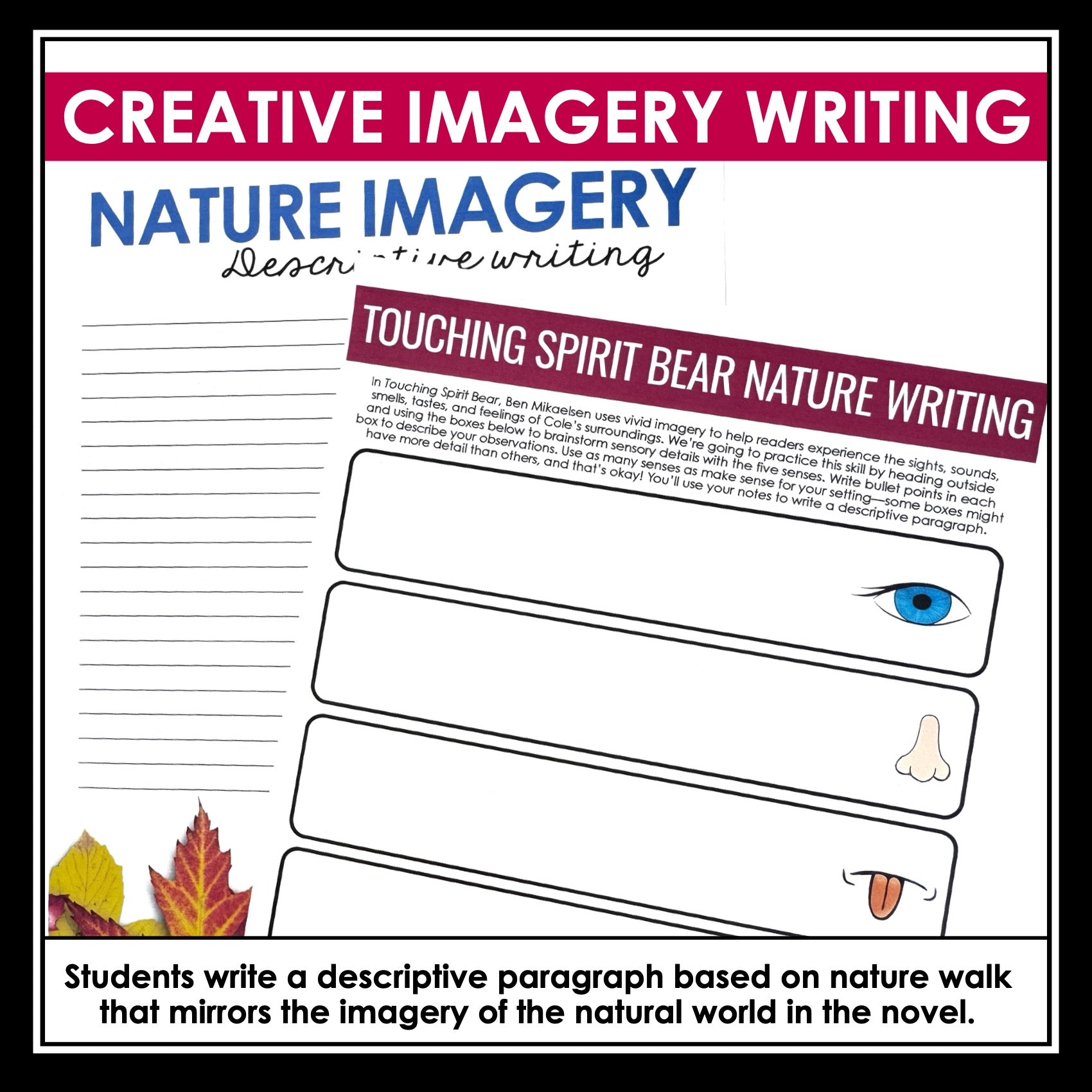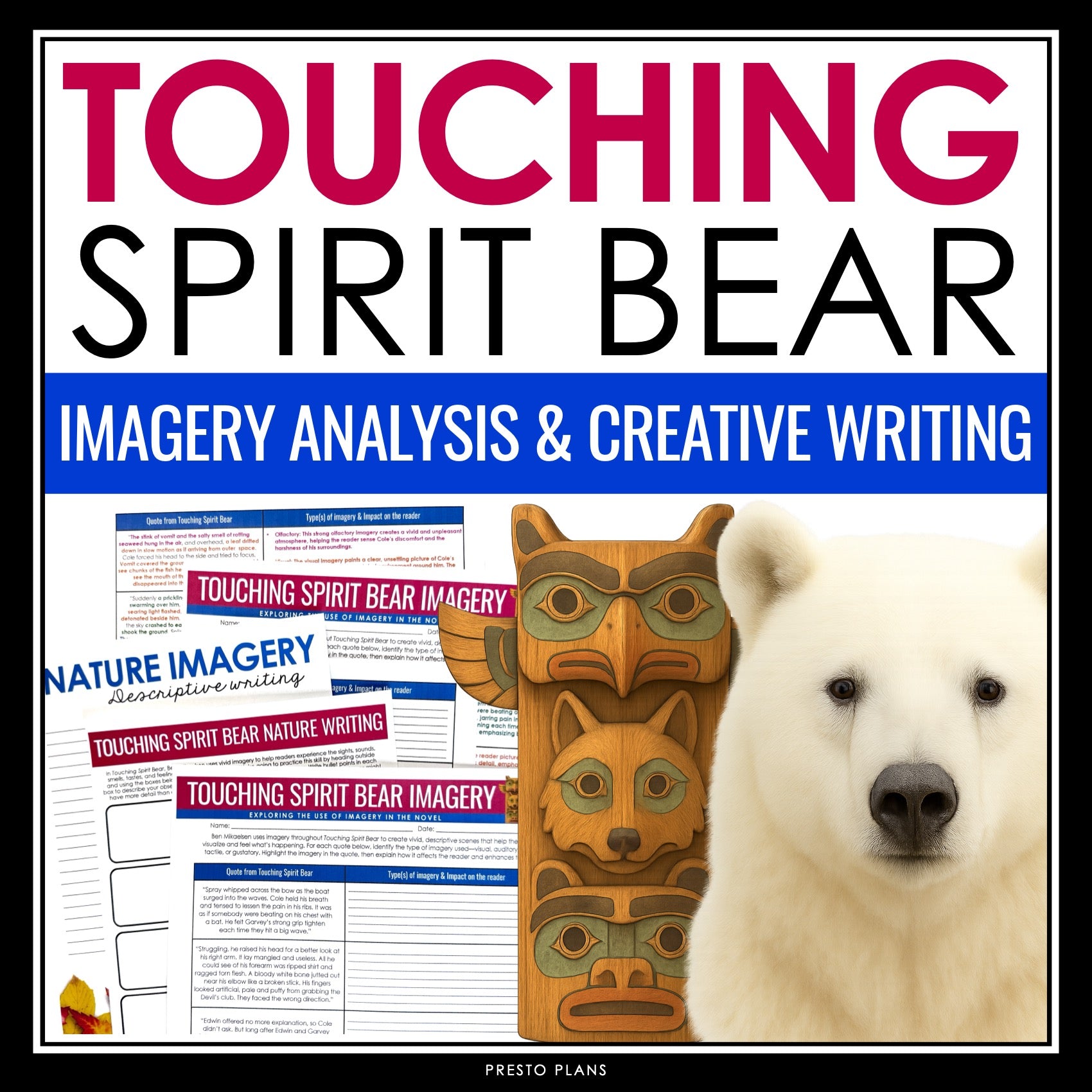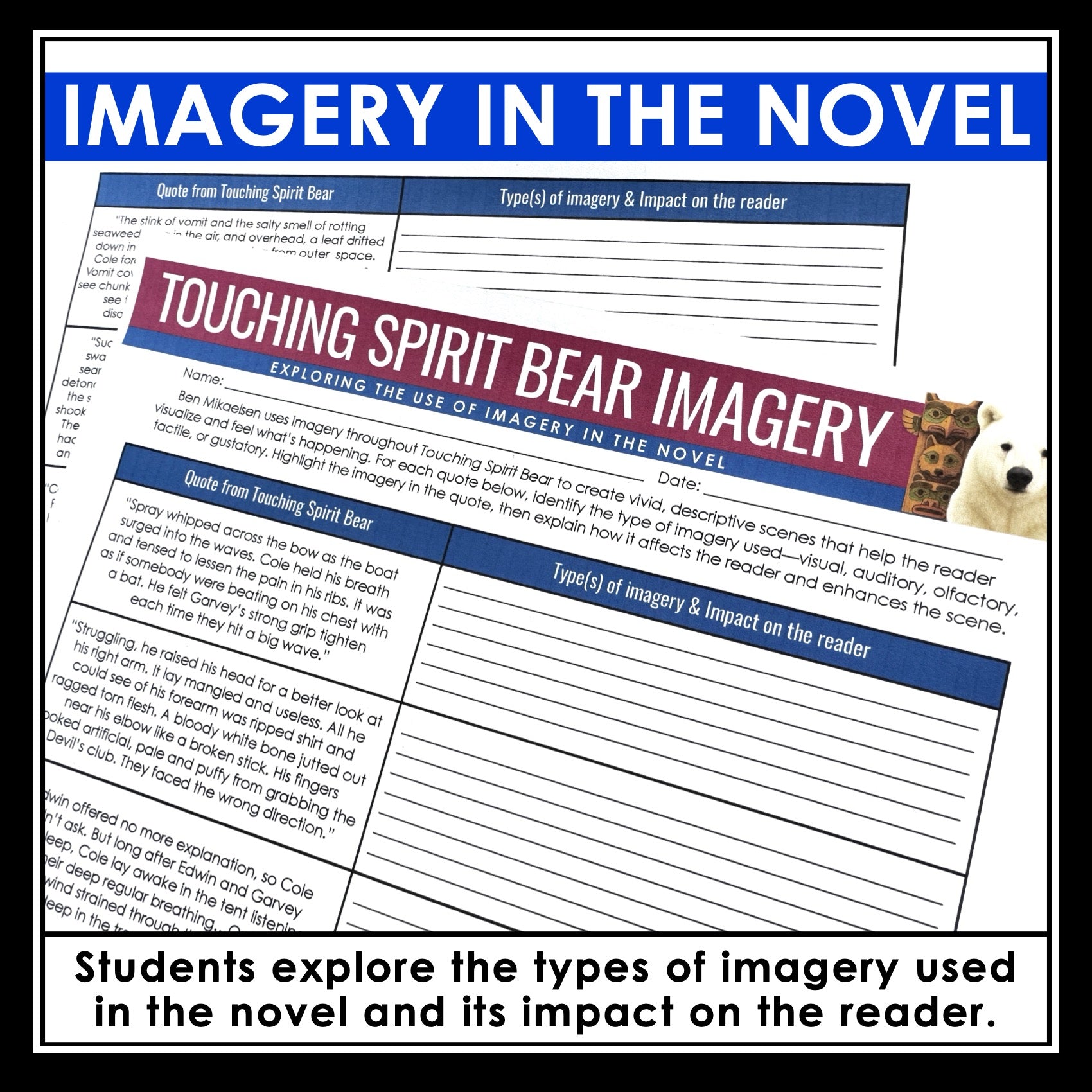 Touching Spirit Bear Activity - Analyzing Novel Imagery & Descriptive Writing: Help your students explore one of Ben Mikaelsen’s most powerful writing techniques with this Touching Spirit Bear imagery lesson and activities. The novel is filled with vivid sensory details that bring Cole’s environment and experiences to life, making imagery an essential element for students to analyze. This ready-to-use resource teaches students the five types of imagery, guides them through analyzing descriptive passages from the novel, and provides opportunities for them to practice writing their own nature-based imagery.