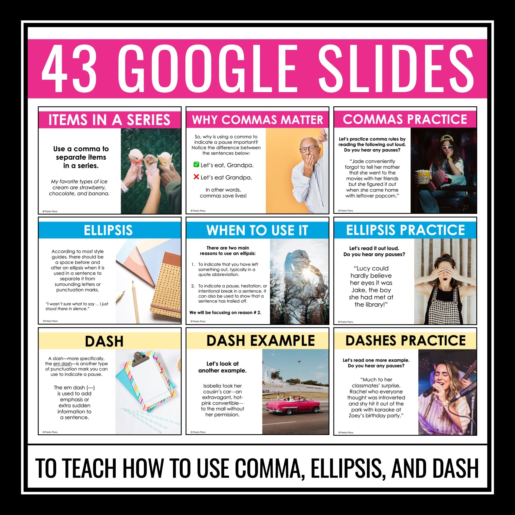 ➡️ Comma, Ellipsis, and Dash Google Slides Presentation: Use this 43-slide Google Slides presentation to introduce student to the rules for using commas, ellipses, and dashes in writing. With examples, practice exercises, and helpful tips, students gain a clear understanding of how to use these punctuation marks effectively in their own writing.