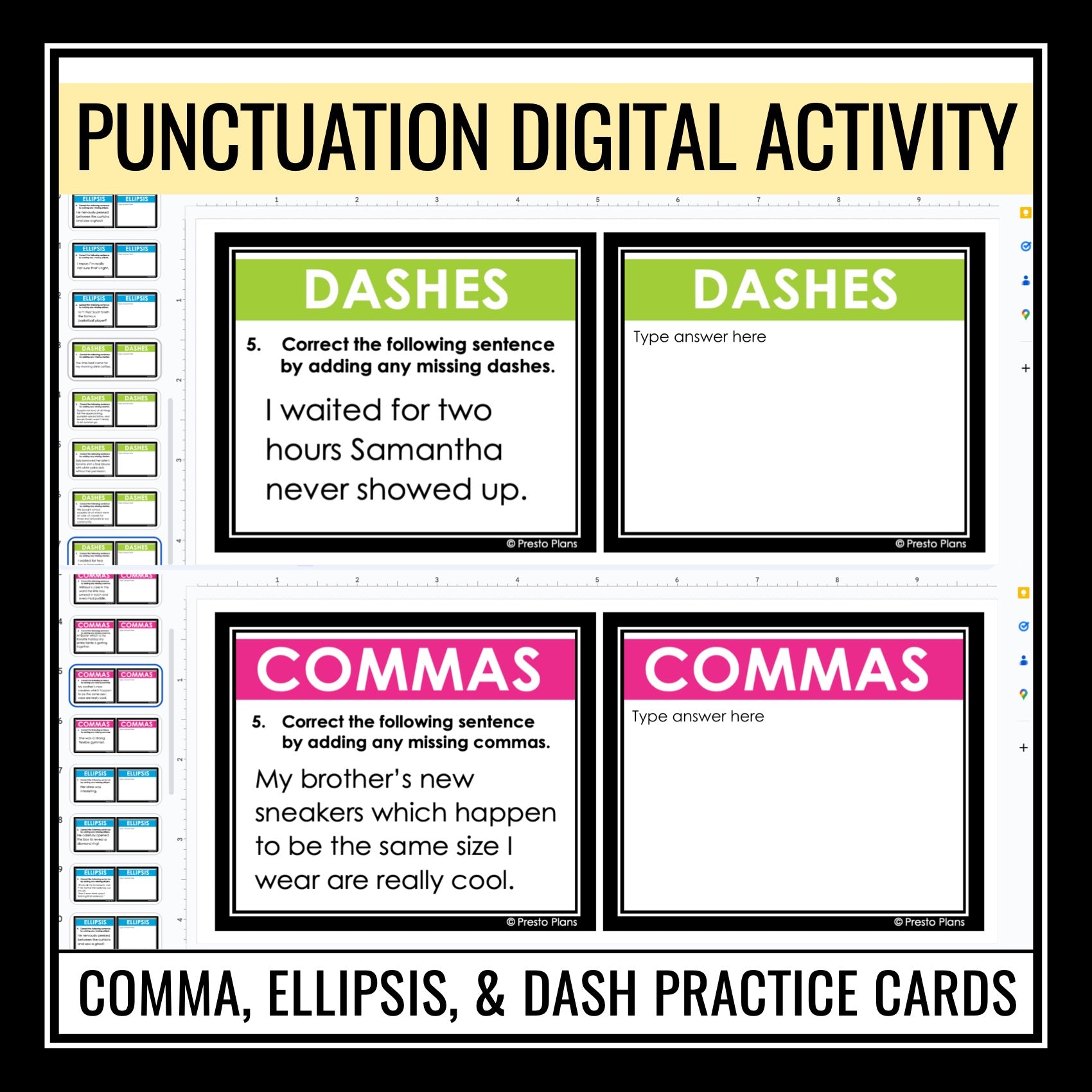 ➡️ Comma, Ellipsis, and Dash Digital Task Card Activity: This engaging digital task card activity complements the presentation by offering students practice with applying comma, ellipsis, and dash rules. The set includes 18 digital task cards, each presenting a unique scenario or sentence where students must identify and correctly use the appropriate punctuation mark on a student response sheet. The cards have different tasks: