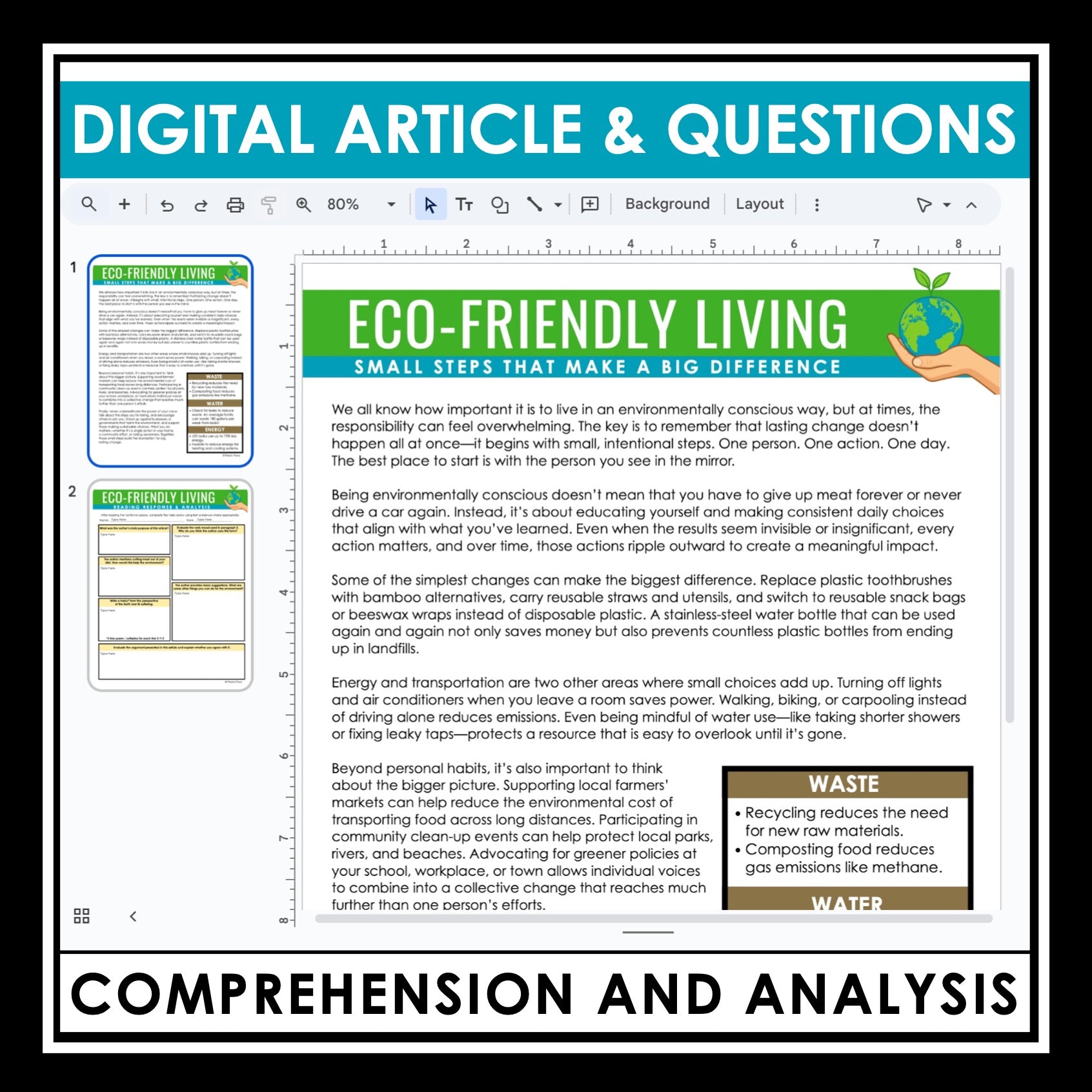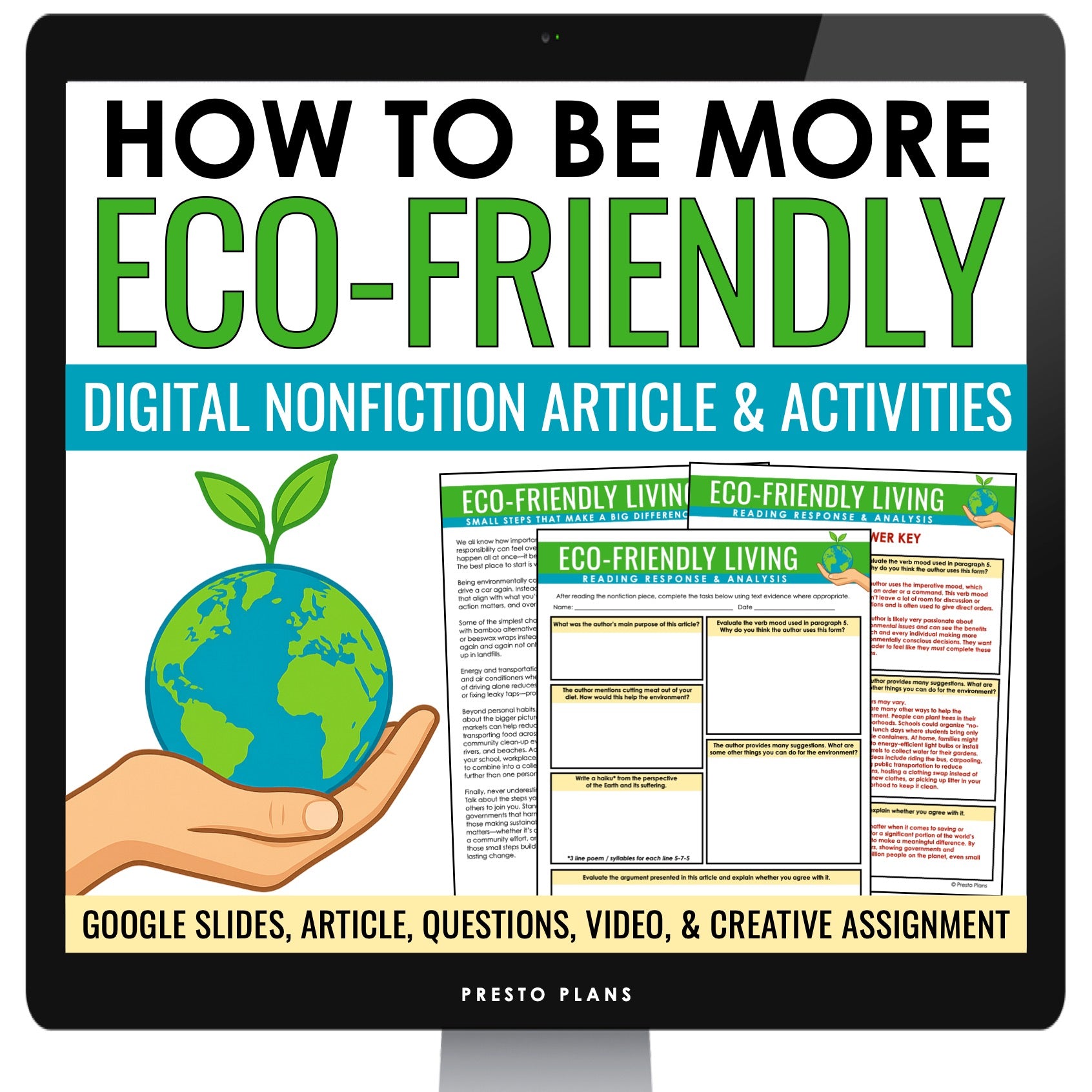 Nonfiction Reading Comprehension Digital Article and Activities - Eco-Friendly Living: Bring nonfiction into your classroom with this comprehensive digital resource, designed to meet your informational text standards. Use the included Google slides to guide this high-interest nonfiction reading comprehension lesson where students will read an article about eco-friendly and environmentally conscious living. Students will then show their comprehension and analysis of the article with a ready-to-use digital response assignment, focusing on author’s purpose, making inferences, verb mood choices, making connections, evaluating arguments, and creative response. Also included is a fun and creative digital assignment where students reflect on their carbon footprint and how they could make changes to be more environmentally friendly. This eco-friendly living nonfiction reading comprehension lesson has everything you need to help your students be stronger at reading and analyzing informational texts.