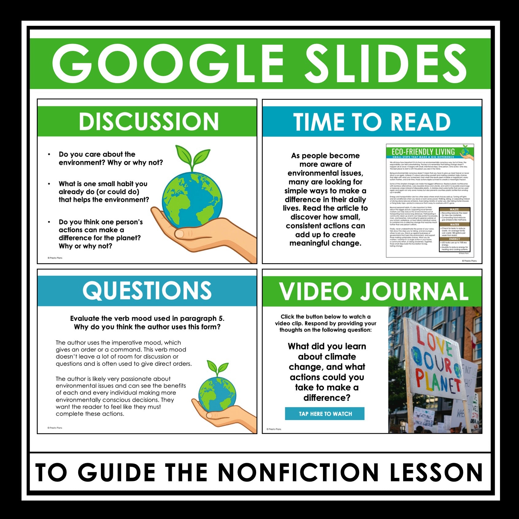 ➡️ Eco-Friendly Living Google Slides: Use this Google Slides presentation to guide you through every element of the lesson. From pre-reading discussion questions to activity prompts and answer keys, each slide is crafted to facilitate engaging classroom discussions. Additionally, the presentation includes a link to a related video and a video writing prompt, enabling students to make meaningful text-to-self connections.