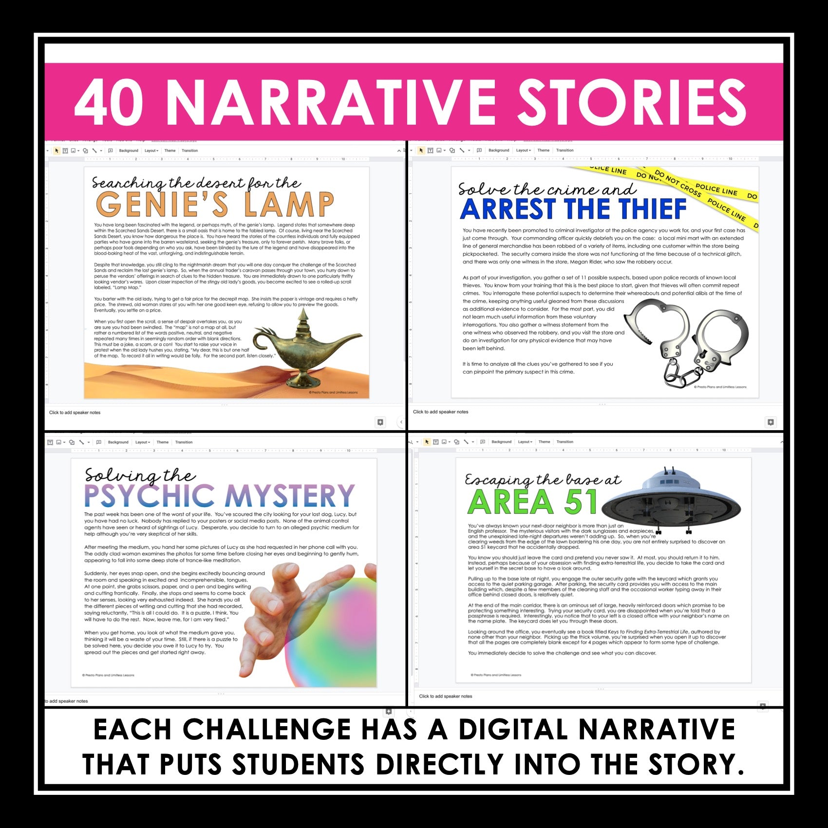 ➡️ 40 Narrative Stories: Engage your students with original narrative stories that put them in the middle of an exciting scenario related to the reading concept. Reading the story as a class hooks students and sets up the accompanying challenge.