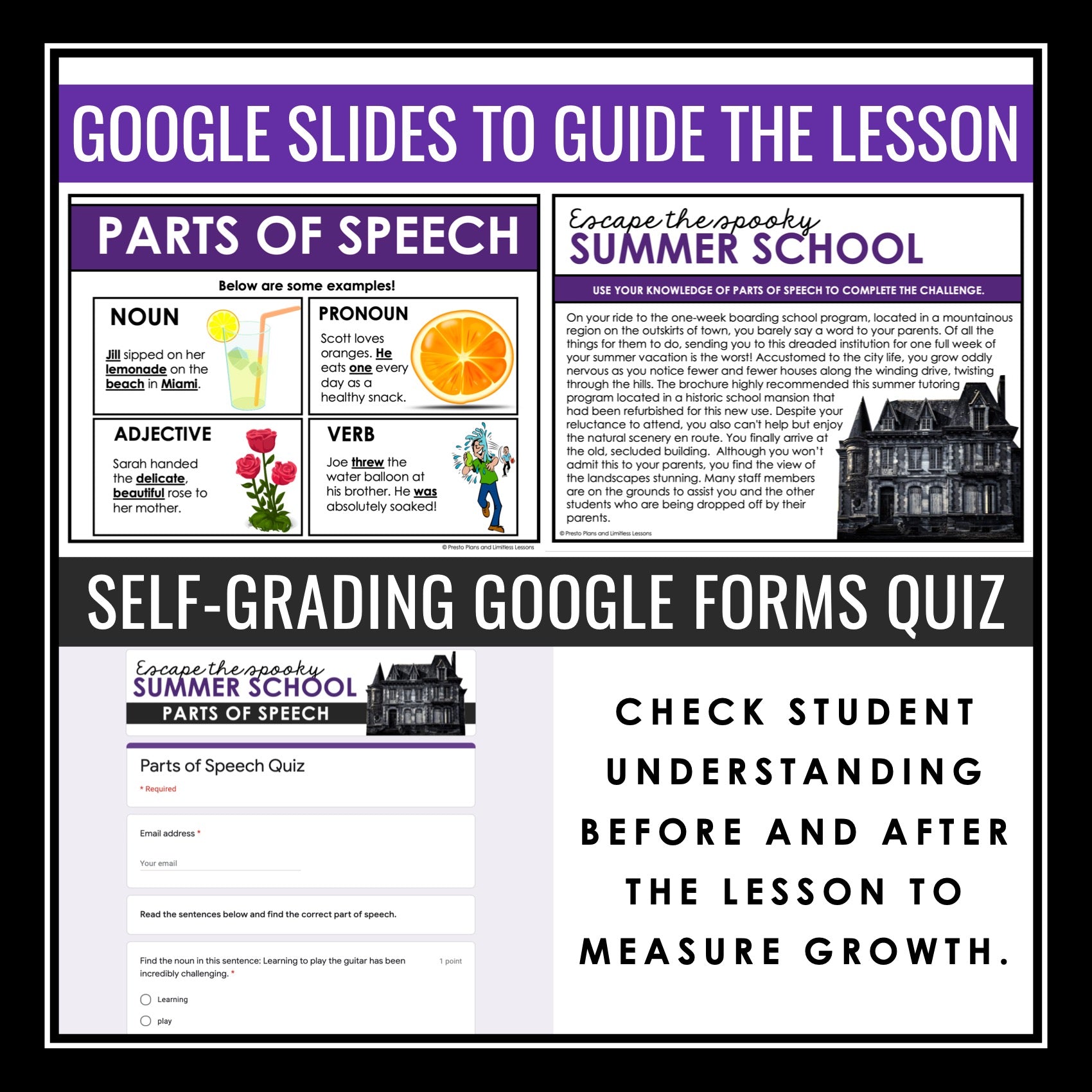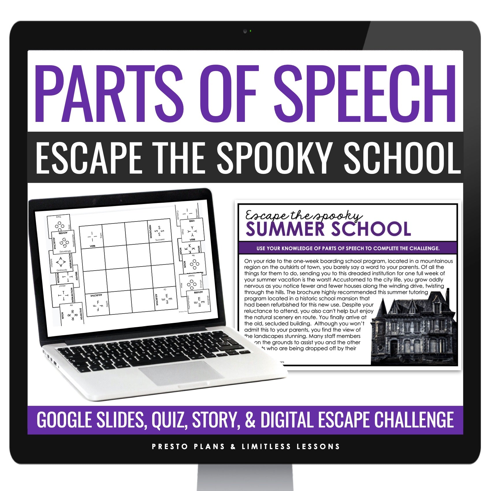 Parts of Speech Escape Room Digital Grammar Activity, Google Slides, and Quiz