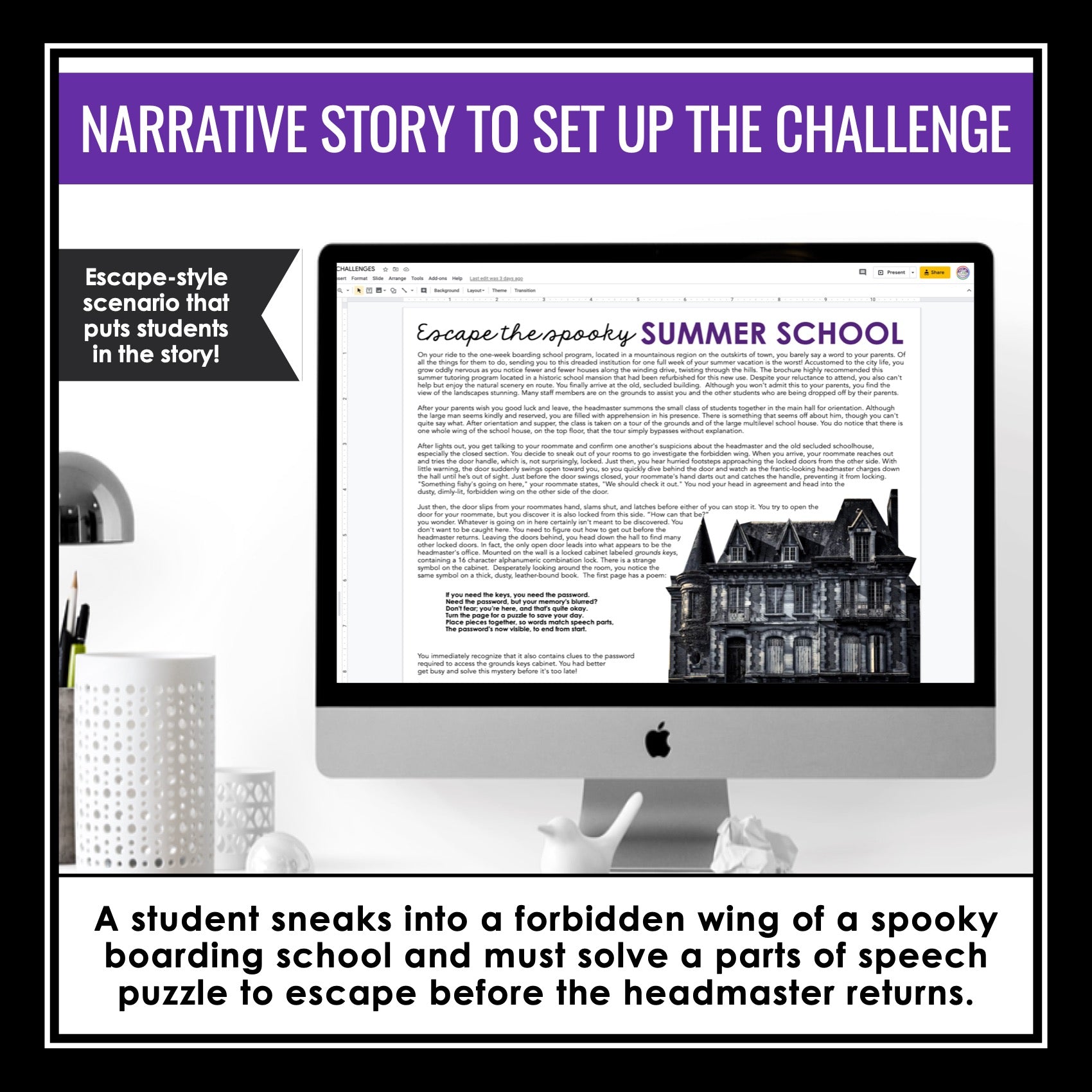 This digital parts of speech grammar escape room style challenge is a new and fun way to engage your students and improve their understanding of parts of speech! The detailed Google Slides presentation introduces parts of speech with clear examples, ensuring student understanding from the start, and a pre or post-assessment self-grading Google Forms quiz allows you to assess student understanding effectively. The highlight of the resource is the engaging digital escape room-style challenge, where students read an original narrative back story where they must find the truth about the headmaster at their spooky boarding school. Then, they must collaborate in groups to crack a parts of speech-related challenge to unlock the solution to access a safe with mysterious information about their school's leader.