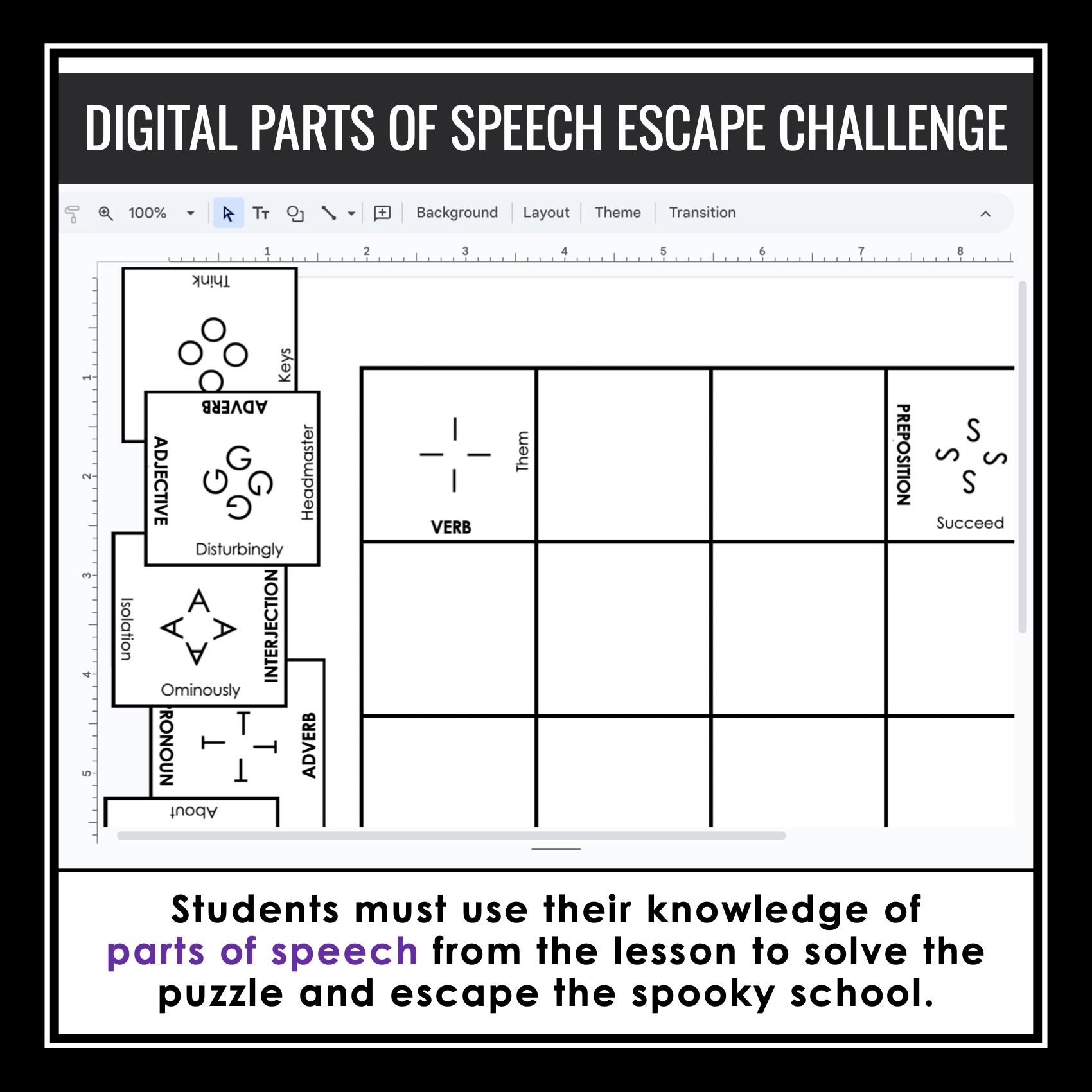 ➡️ Parts of Speech Digital Escape Room Style Challenge: In this interactive escape-room style parts of speech challenge, students must put together a puzzle that lines up each part of speech with its correct example to reveal a hidden phrase they need to unlock the cabinet.
